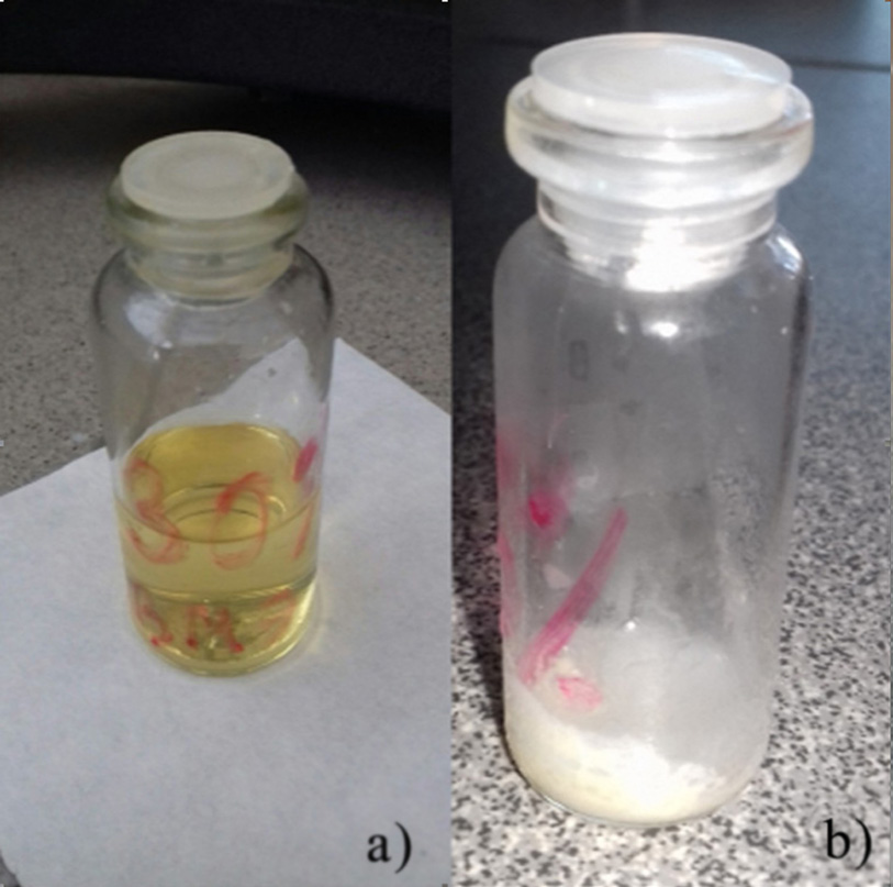 1. Fig. 2. A typical view of the PVME–water system, below (a) and above (b) the binodal curve