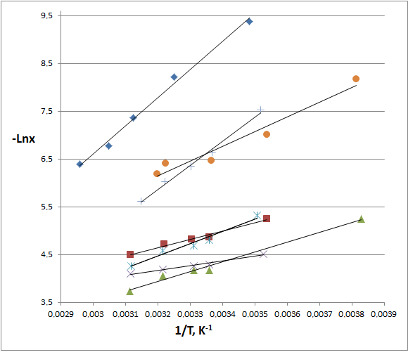 1. Fig. 6. Solubility polytherms of 5OBA: – n-hexane, – n-octane, – cyclohexane, – benzene, – toluene, – propan-1-ol, – ethyl acetate. | |