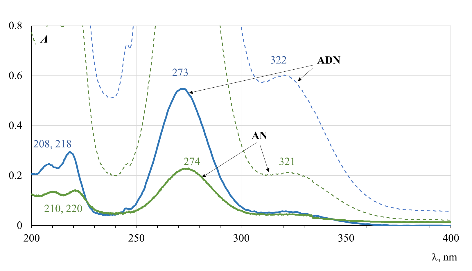 1. Fig. 4. UV spectra of PdBr2–AN and PdBr2–ADN solutions, in 0.01 mm cuvettes (solid line) and 0.1 mm cuvettes (dashed line)