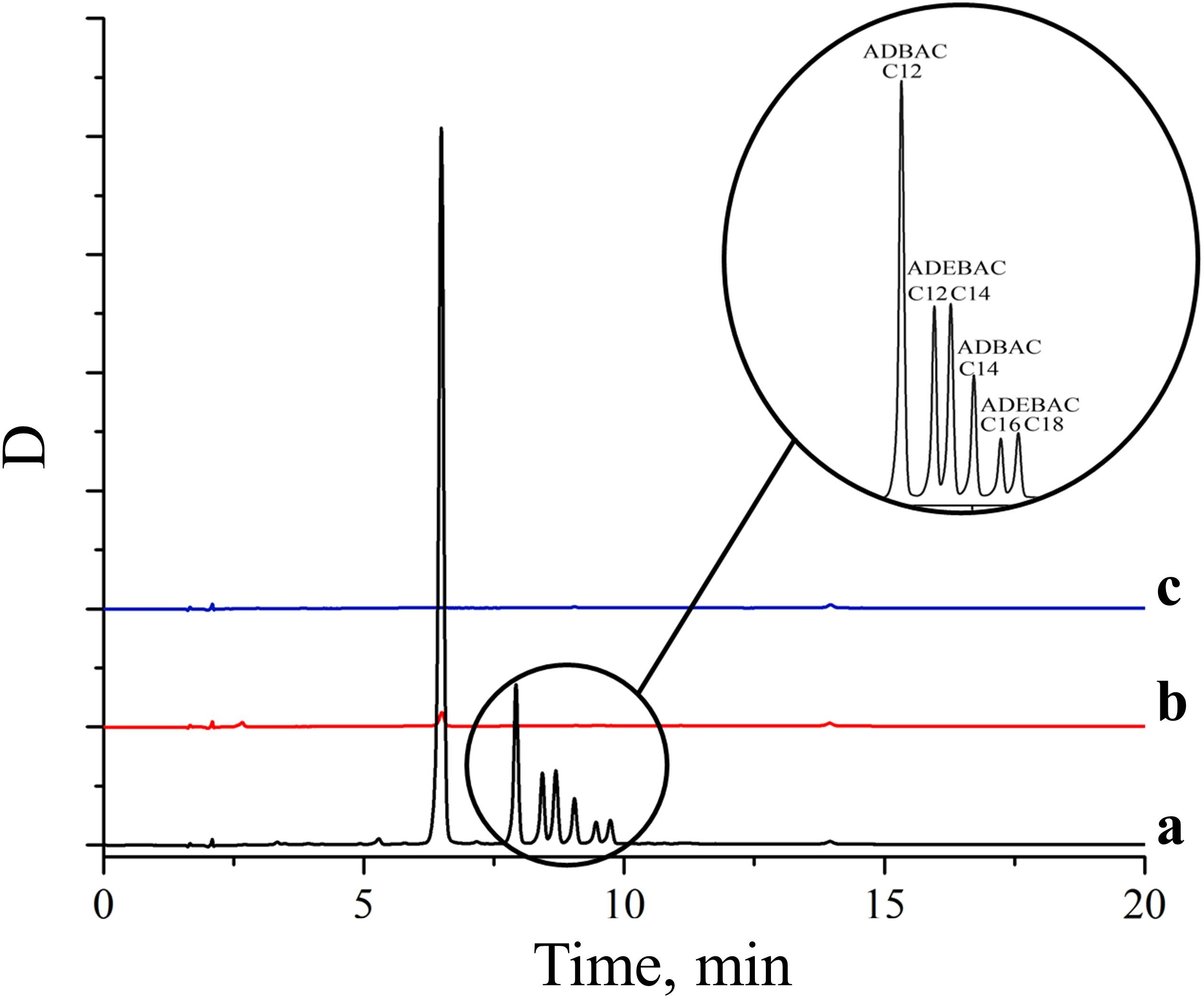 1. Fig. 4. Method 1, Surfactant column: a – chromatogram of a mixture of CHG, ADBAC, and ADEBAC; b – chromatogram of a 0.2% PHMB solution in deionized water; c – chromatogram of a 0.2% solution of N,N-bis- (3-aminopropyl)-dodecylamine in deionized water