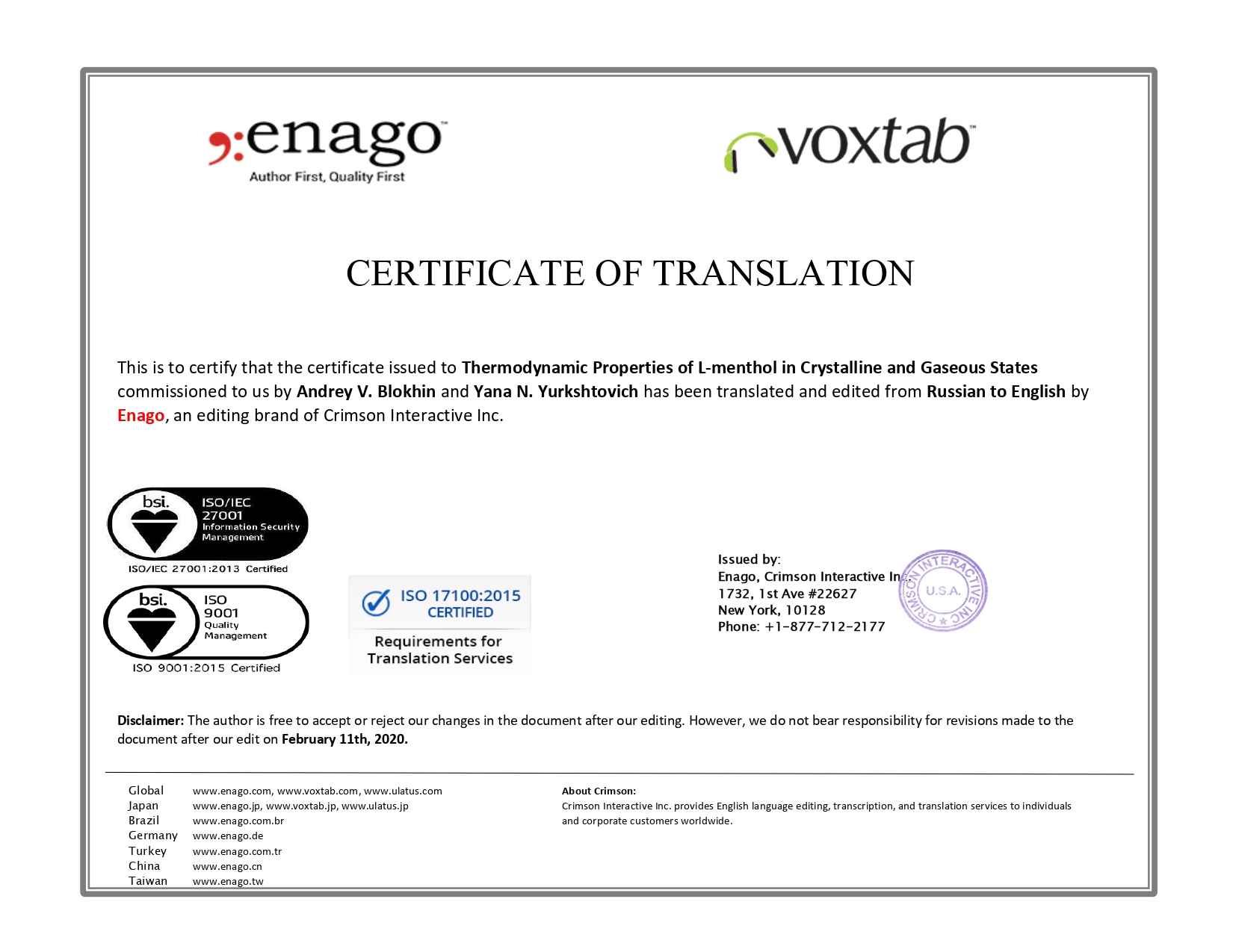 2. This is to certify that the certificate issued to Thermodynamic Properties of L-menthol in Crystalline and Gaseous States commissioned to Enago by Andrey V. Blokhin and Yana N. Yurkshtovich has been translated and edited from Russian to English by Enago, an editing brand of Crimson Interactive Inc. | |