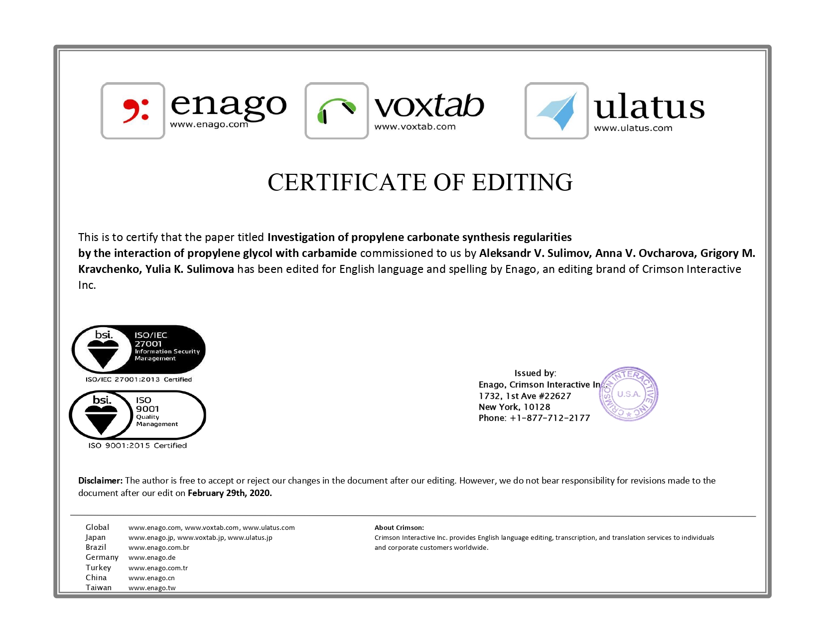 2. This is to certify that the paper titled Investigation of propylene carbonate synthesis regularitiesby the interaction of propylene glycol with carbamide commissioned to Enago by Aleksandr V. Sulimov, Anna V. Ovcharova, Grigory M. Kravchenko, Yulia K. Sulimova has been edited for English language and spelling by Enago, an editing brand of Crimson Interactive Inc.