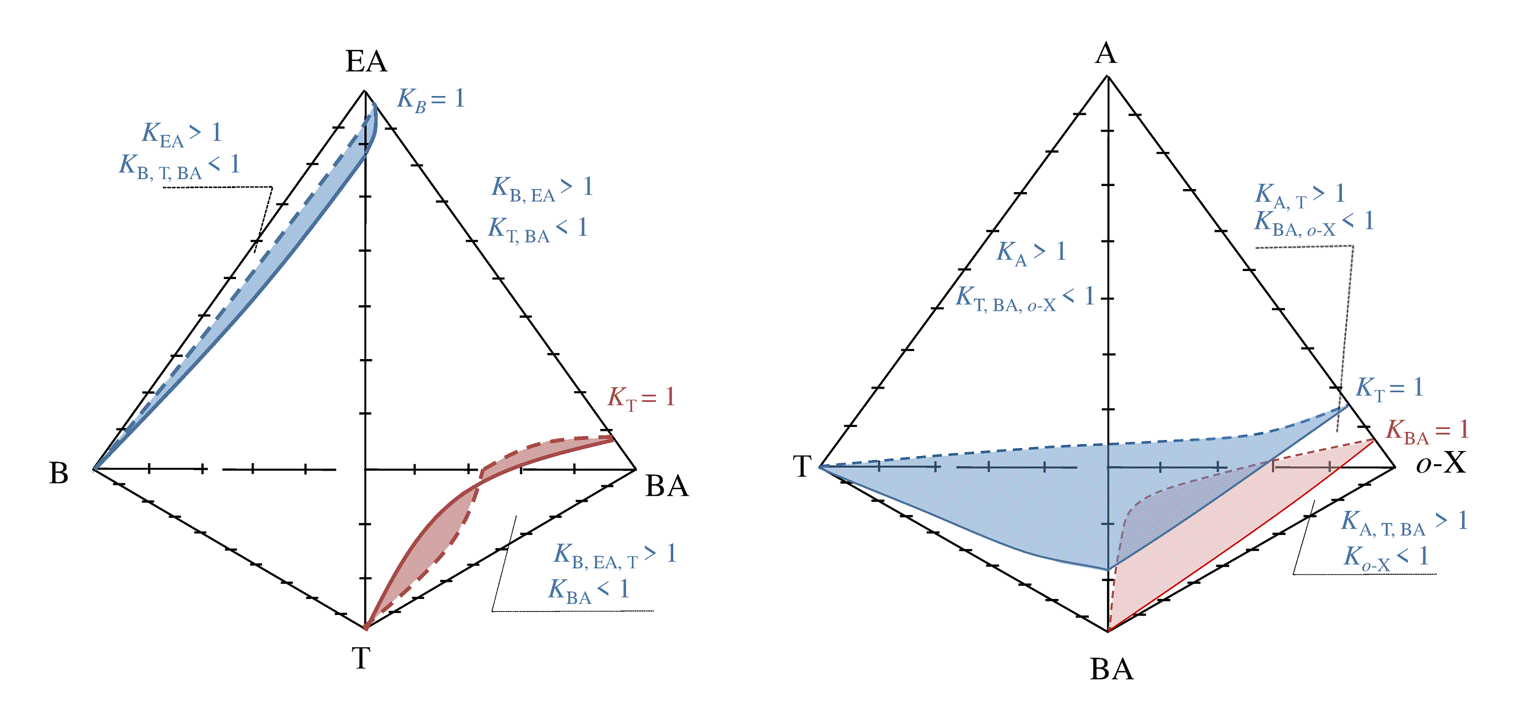1. Diagrams of the unit K-surfaces of the systems: ethyl acetate (EA)–benzene (B)–toluene (T)–butyl acetate (BA) (a) and acetone (A)–toluene (T)–butyl acetate (BA)–o-xylene (o-X) (b) at 760 mm Hg.
