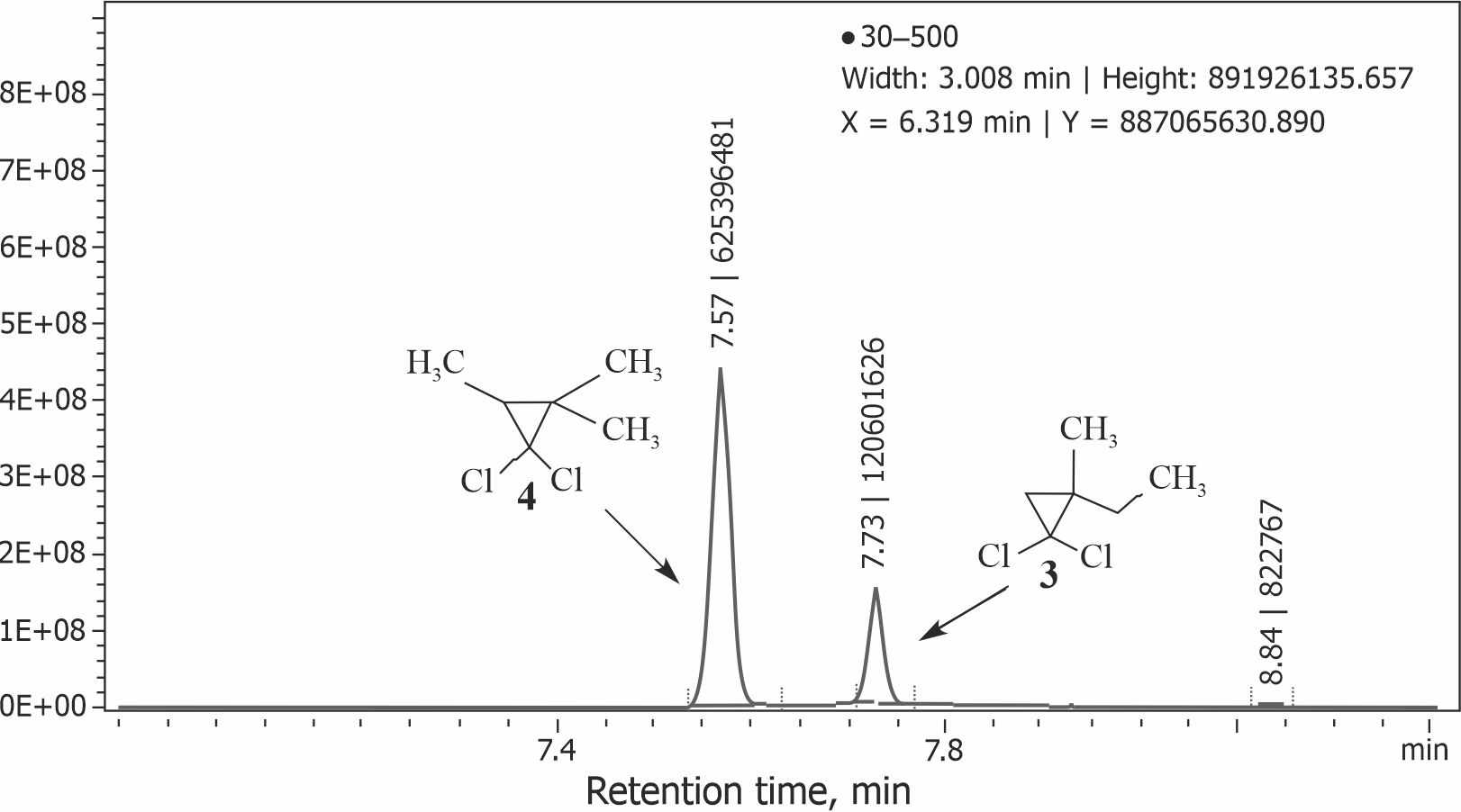 1. Chromatogram of a mixture of alkyl-gem-dichlorocyclopropanes 3, 4.