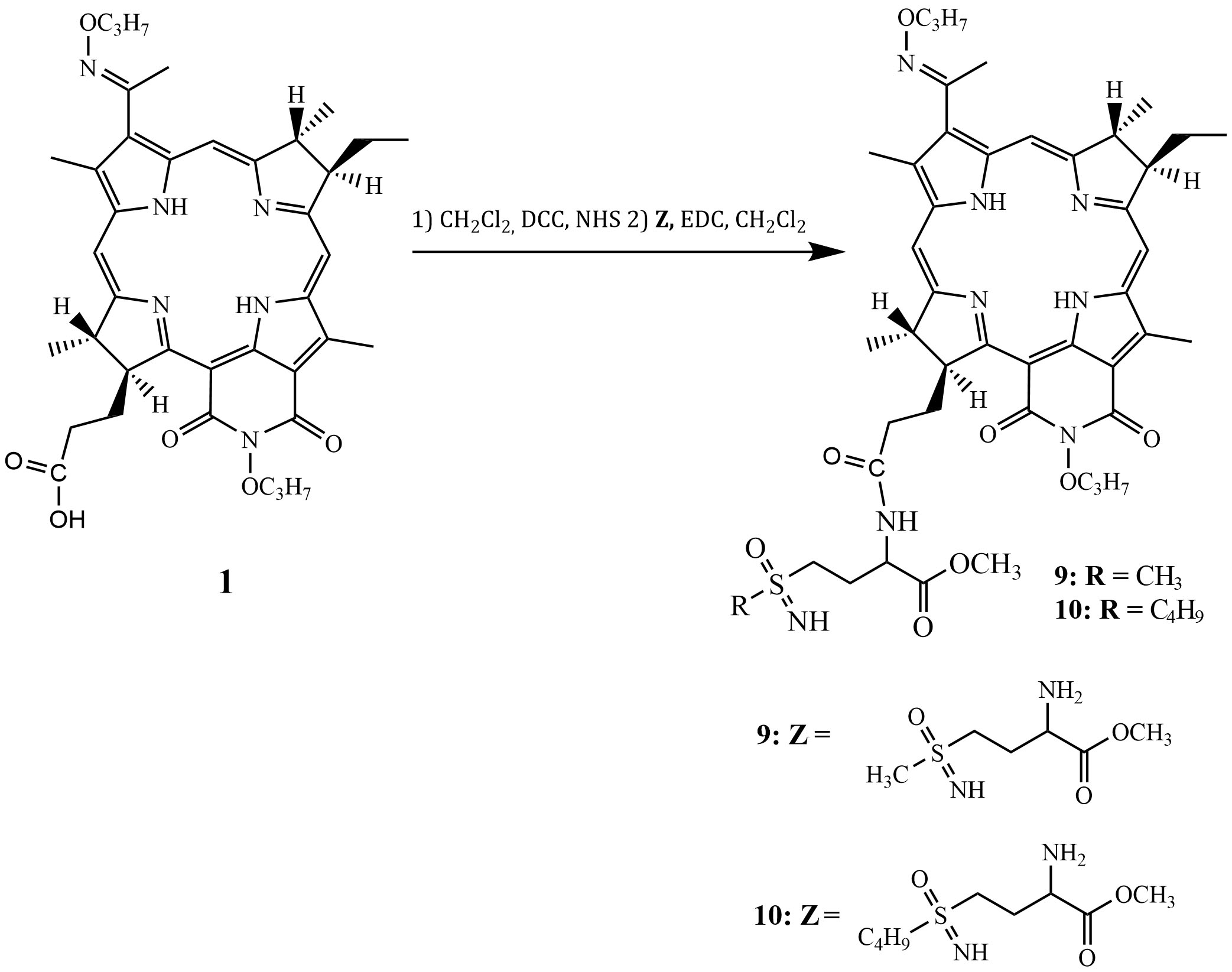 1. Synthesis of the conjugate of dipropoxybacteriopurpurinimide with methyl ester of L-methionine sulfoximine and L-(S,R)-butionine sulfoximine | |