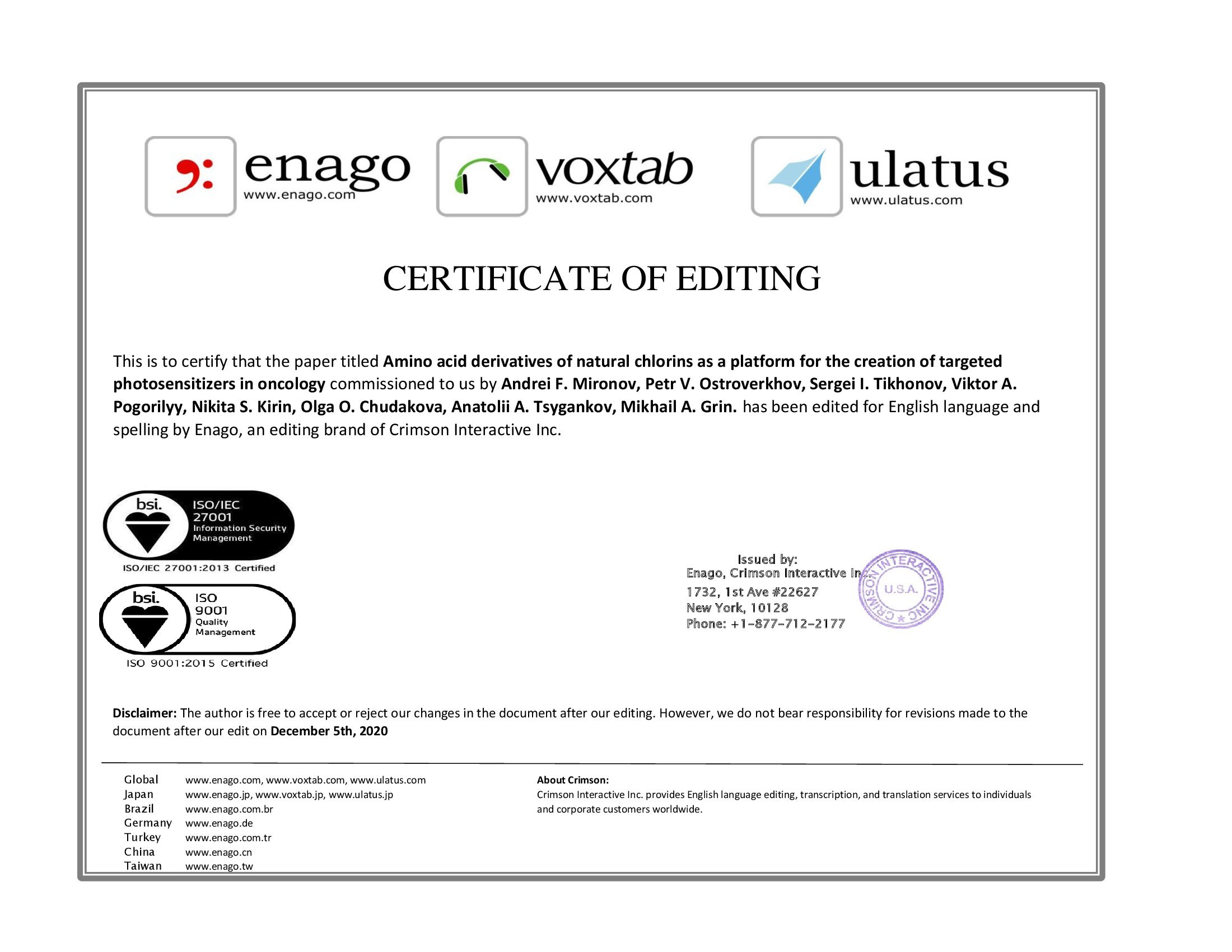 2. This is to certify that the paper titled Amino acid derivatives of natural chlorins as a platform for the creation of targeted photosensitizers in oncology commissioned to us by Andrei F. Mironov, Petr V. Ostroverkhov, Sergei I. Tikhonov, Viktor A. Pogorilyy, Nikita S. Kirin, Olga O. Chudakova, Аnatolii А. Tsygankov, Mikhail A. Grin. has been edited for English language and spelling by Enago, an editing brand of Crimson Interactive Inc. | |