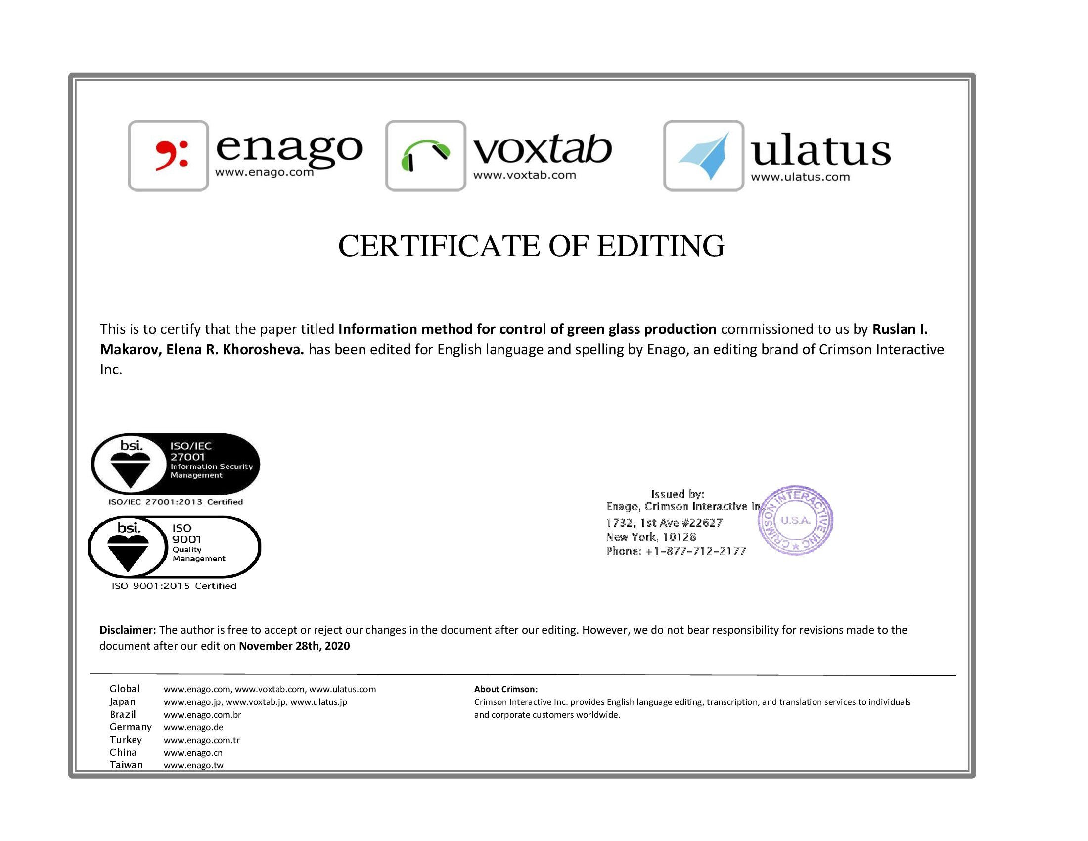 1. This is to certify that the paper titled Information method for control of green glass production commissioned to us by Ruslan I. Makarov, Elena R. Khorosheva. has been edited for English language and spelling by Enago, an editing brand of Crimson Interactive Inc.