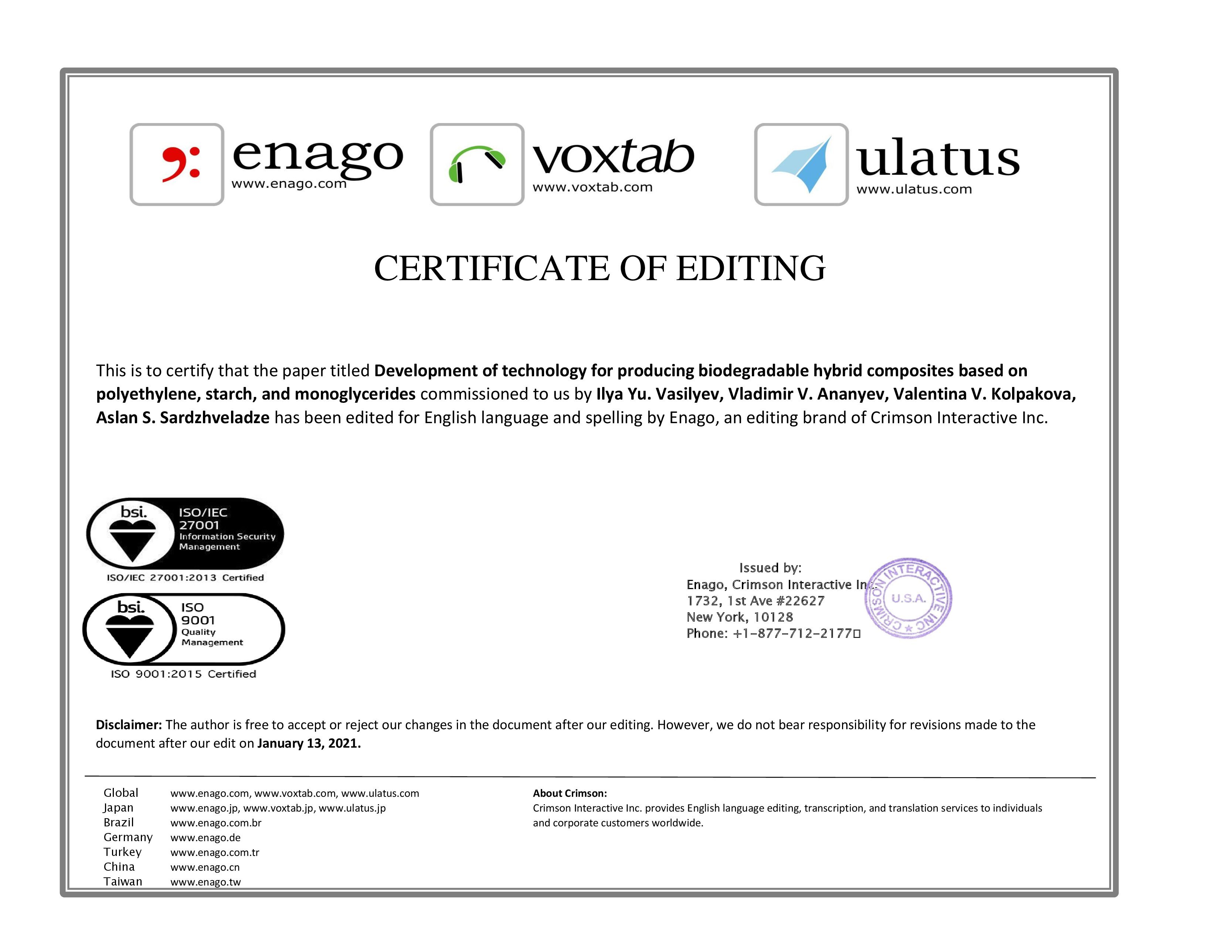 2. This is to certify that the paper titled Development of technology for producing biodegradable hybrid composites based on polyethylene, starch, and monoglycerides commissioned to us by Ilya Yu. Vasilyev, Vladimir V. Ananyev, Valentina V. Kolpakova, Aslan S. Sardzhveladze has been edited for English language and spelling by Enago, an editing brand of Crimson Interactive Inc.