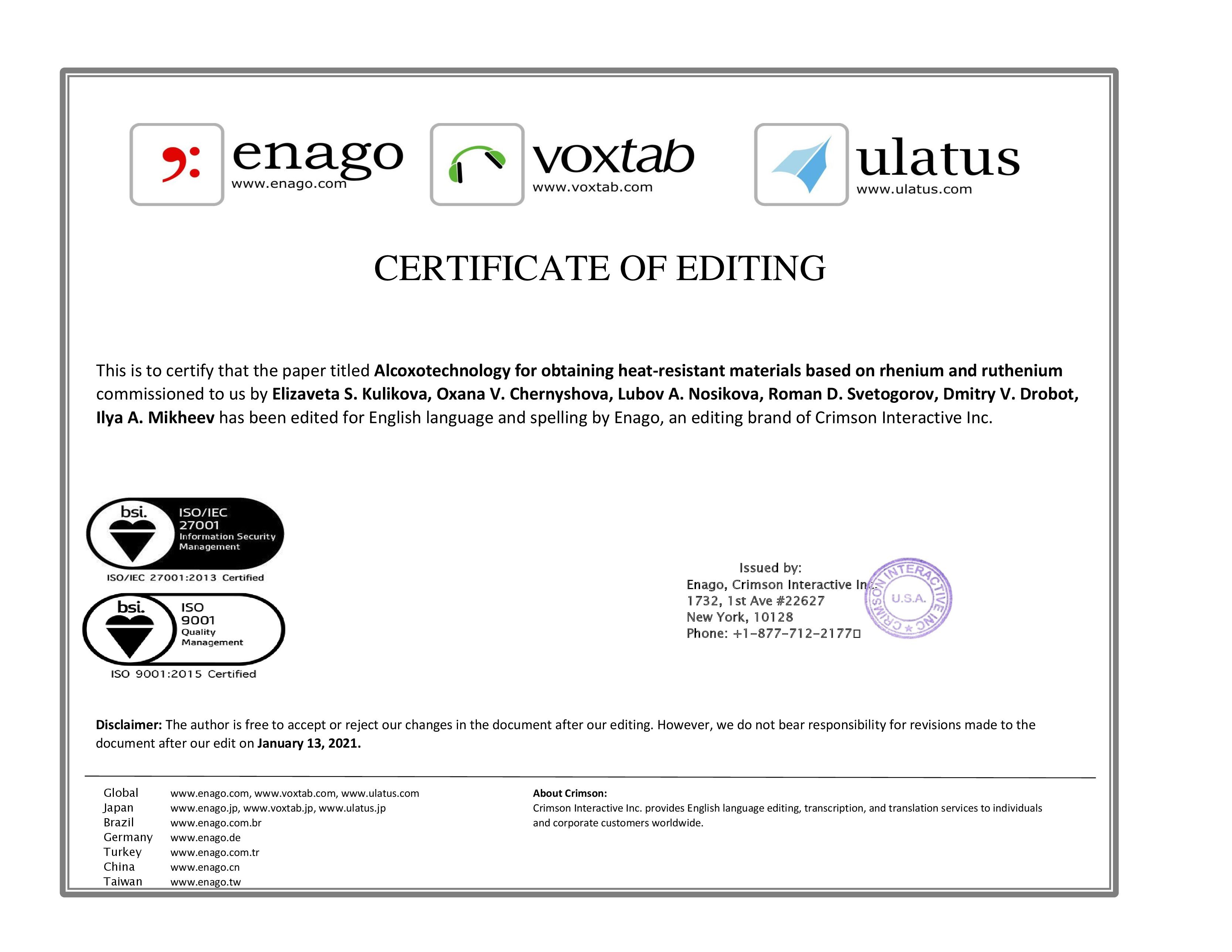 2. This is to certify that the paper titled Alcoxotechnology for obtaining heat-resistant materials based on rhenium and ruthenium commissioned to us by Elizaveta S. Kulikova, Oxana V. Chernyshova, Lubov A. Nosikova, Roman D. Svetogorov, Dmitry V. Drobot, Ilya A. Mikheev has been edited for English language and spelling by Enago, an editing brand of Crimson Interactive Inc. | |