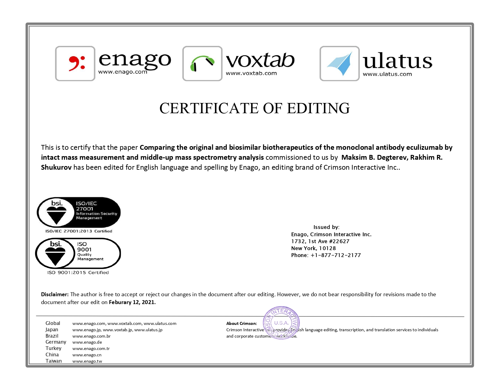 2. This is to certify that the paper Comparing the original and biosimilar biotherapeutics of the monoclonal antibody eculizumab by intact mass measurement and middle-up mass spectrometry analysis commissioned to us by Maksim B. Degterev, Rakhim R. Shukurov has been edited for English language and spelling by Enago, an editing brand of Crimson Interactive Inc. | |
