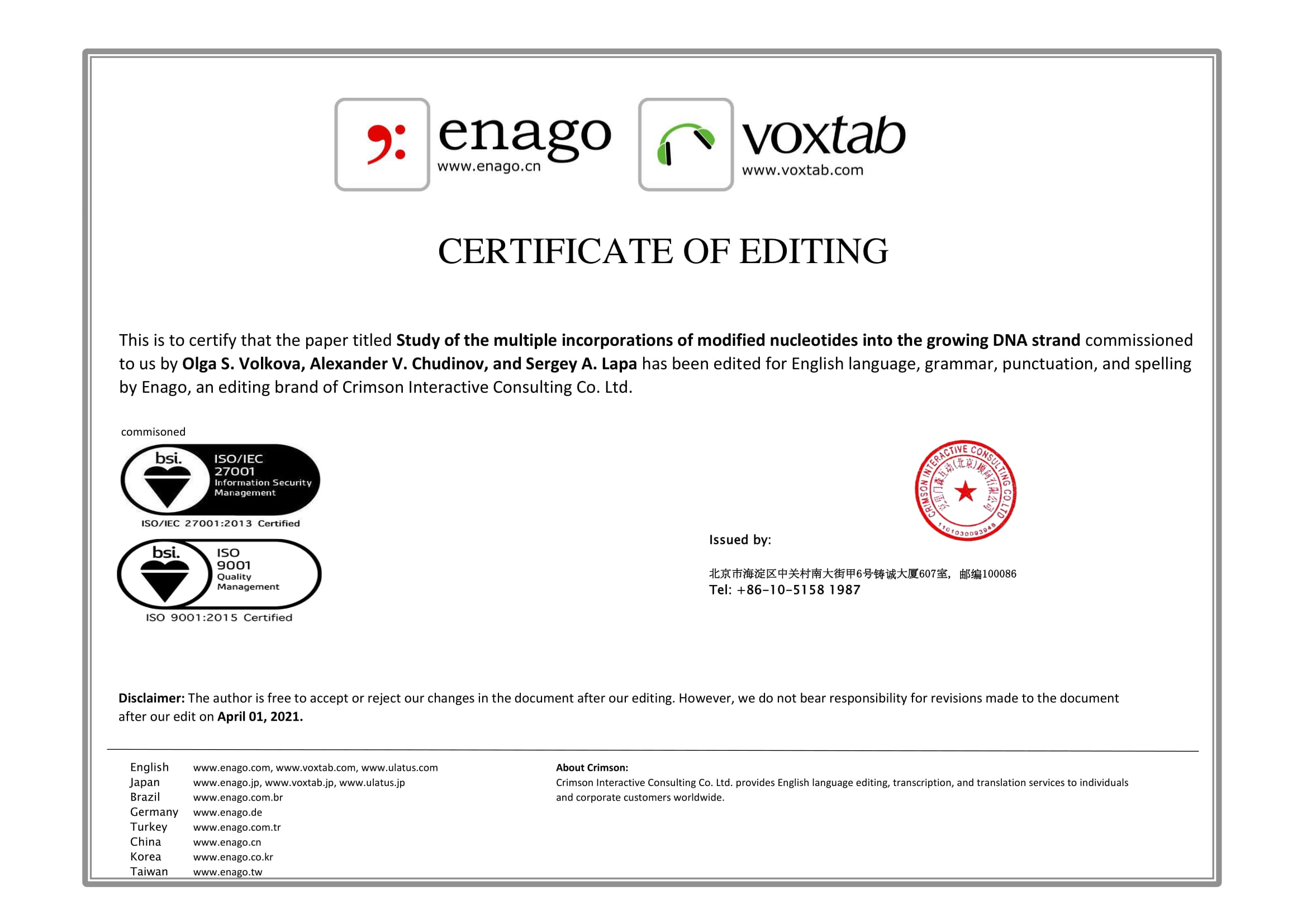 2. This is to certify that the paper titled Study of the multiple incorporations of modified nucleotides into the growing DNA strand commissioned to us by Olga S. Volkova, Alexander V. Chudinov, and Sergey A. Lapa has been edited for English language, grammar, punctuation, and spelling by Enago, an editing brand of Crimson Interactive Consulting Co. Ltd.