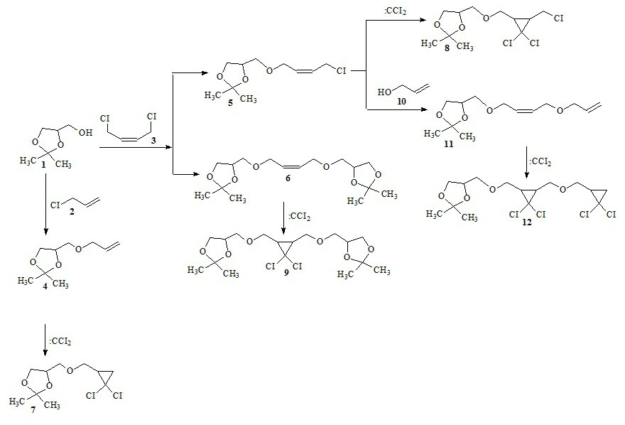 O-alkylation of 2,2-dimethyl-4-hydroxymethyl-1,3-dioxolane 1 with 2 and cis-1,4-dichlorobutene-2 3 proceeded to give the corresponding ethers 46. Dichlorocarbenation of compounds 46 led to products 79. Exhaustive dichlorocarbenation of the compound 11 led to diester 12.