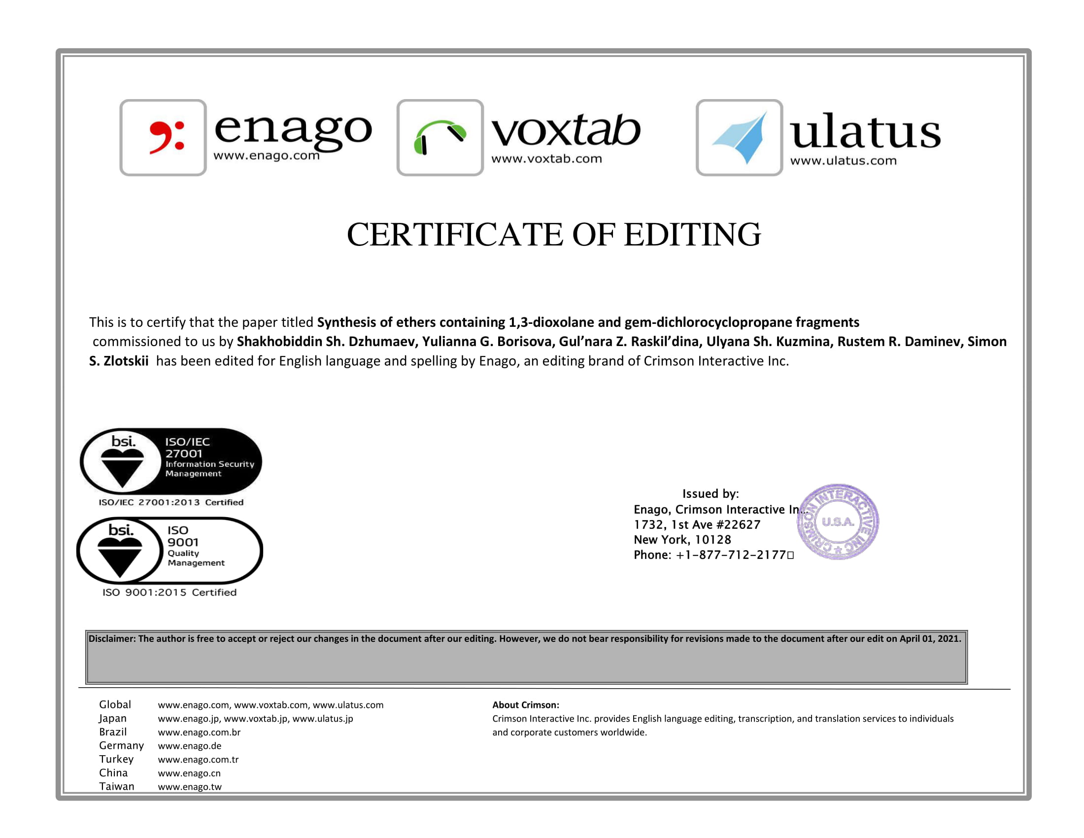 2. This is to certify that the paper titled Synthesis of ethers containing 1,3-dioxolane and gem-dichlorocyclopropane fragments commissioned to us by Shakhobiddin Sh. Dzhumaev, Yulianna G. Borisova, Gul’nara Z. Raskil’dina, Ulyana Sh. Kuzmina, Rustem R. Daminev, Simon S. Zlotskii has been edited for English language and spelling by Enago, an editing brand of Crimson Interactive Inc.