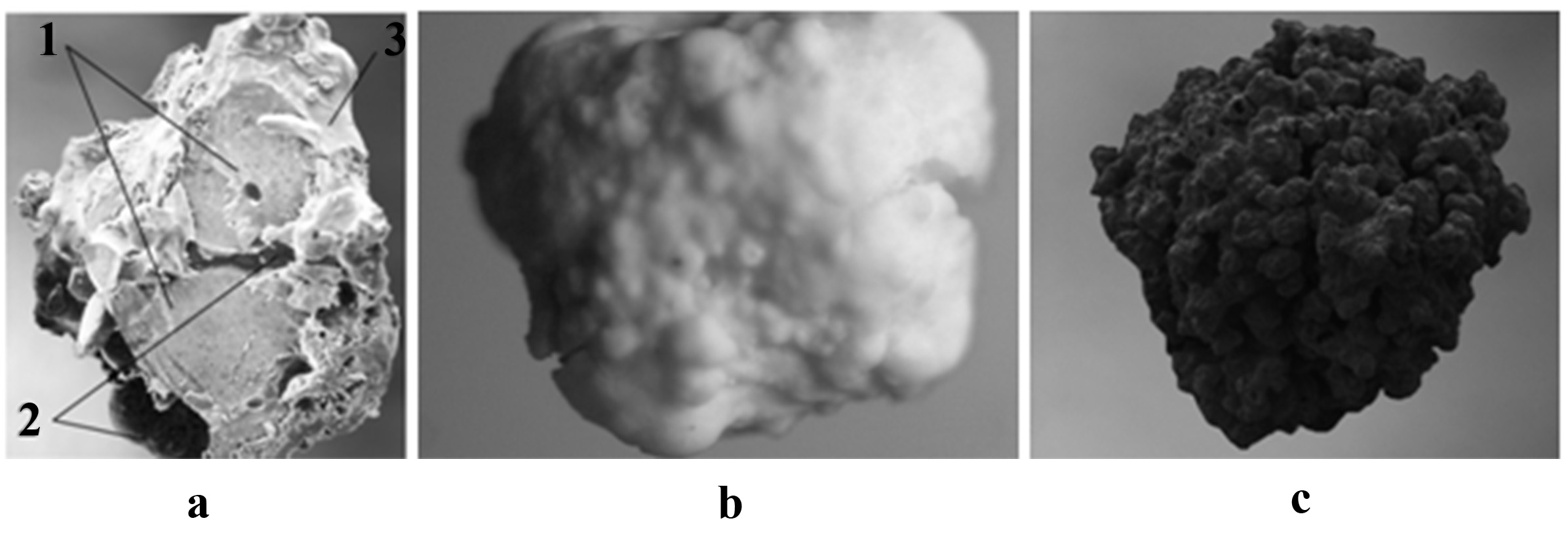 1. Fraction 1.00–1.99 mm: (a) granule from Experiment 10; (b) granule from Experiment 11; (c) granule from Experiment 12. At Fig. a: 1 – contaminated soil, 2 – pitch, 3 – deposits of salts containing heavy metals.