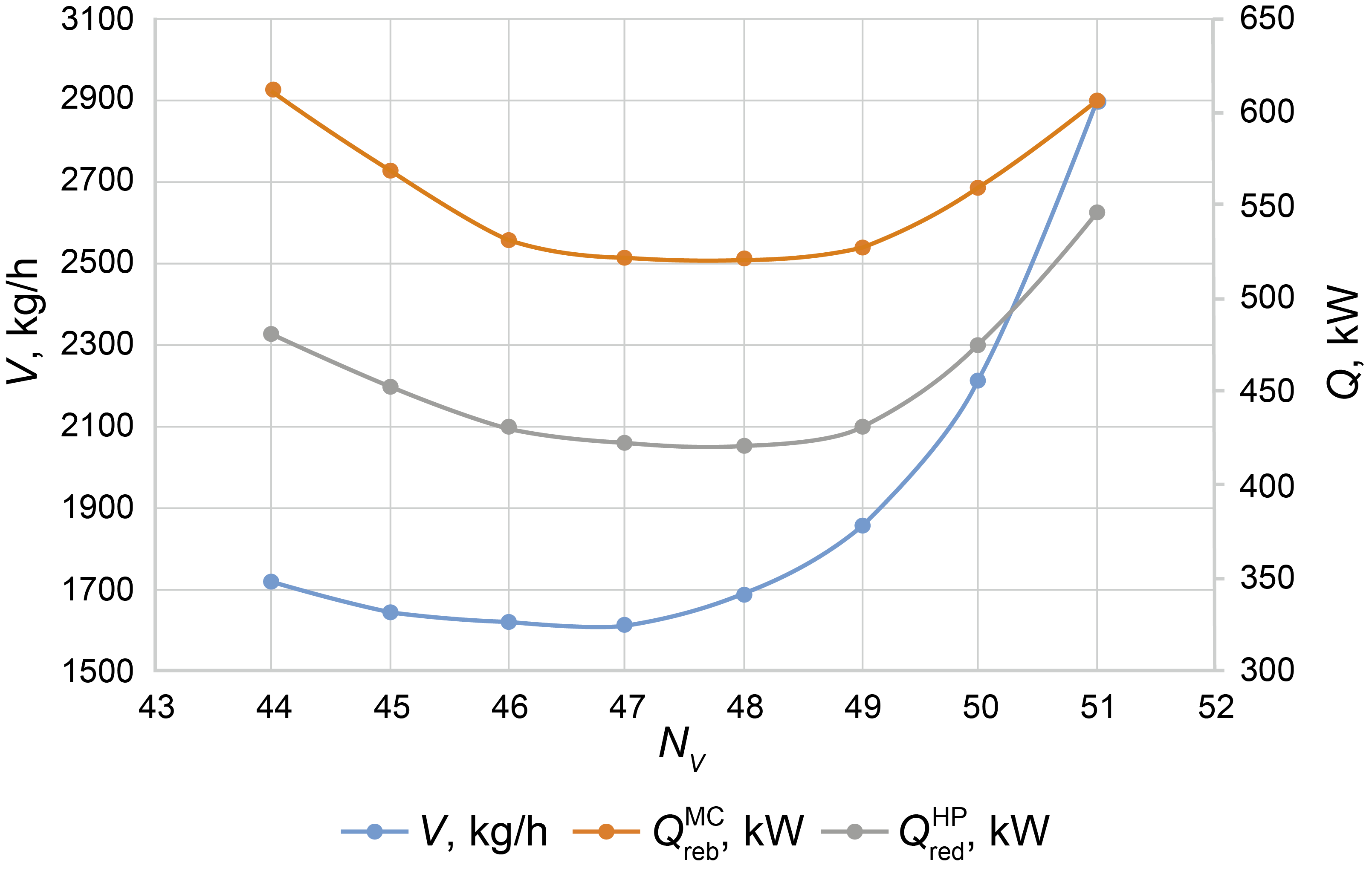 Conclusions. For the extractive distillation of an allyl alcohol–allyl acetate mixture, the optimal modes for the combined use of a PTCDS with a vapor recompression heat pump coincide with the optimal modes for a PTCDS without a heat pump.