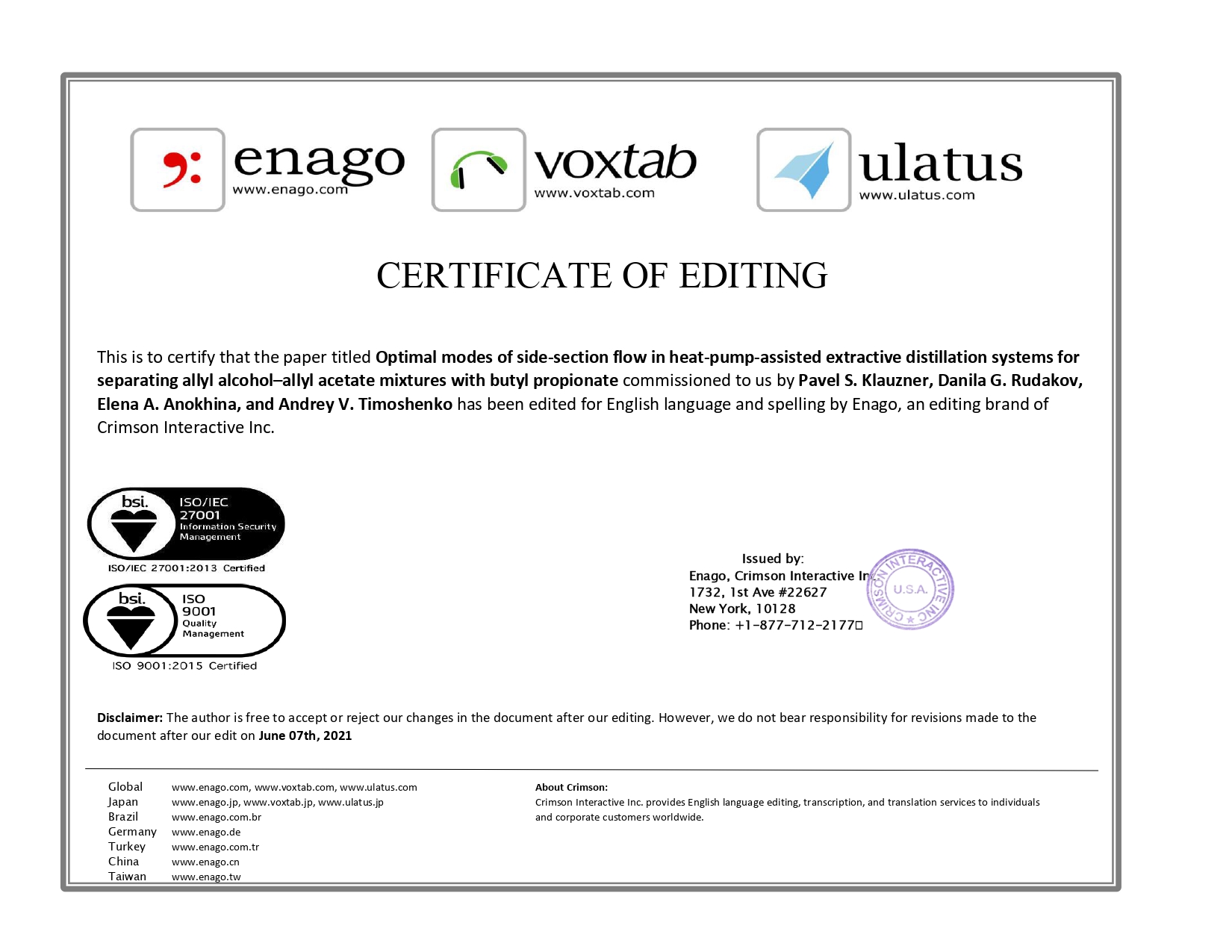 2. This is to certify that the paper titled Optimal modes of side-section flow in heat-pump-assisted extractive distillation systems for separating allyl alcohol–allyl acetate mixtures with butyl propionate commissioned to us by Pavel S. Klauzner, Danila G. Rudakov, Elena A. Anokhina, and Andrey V. Timoshenko has been edited for English language and spelling by Enago, an editing brand of Crimson Interactive Inc. | |