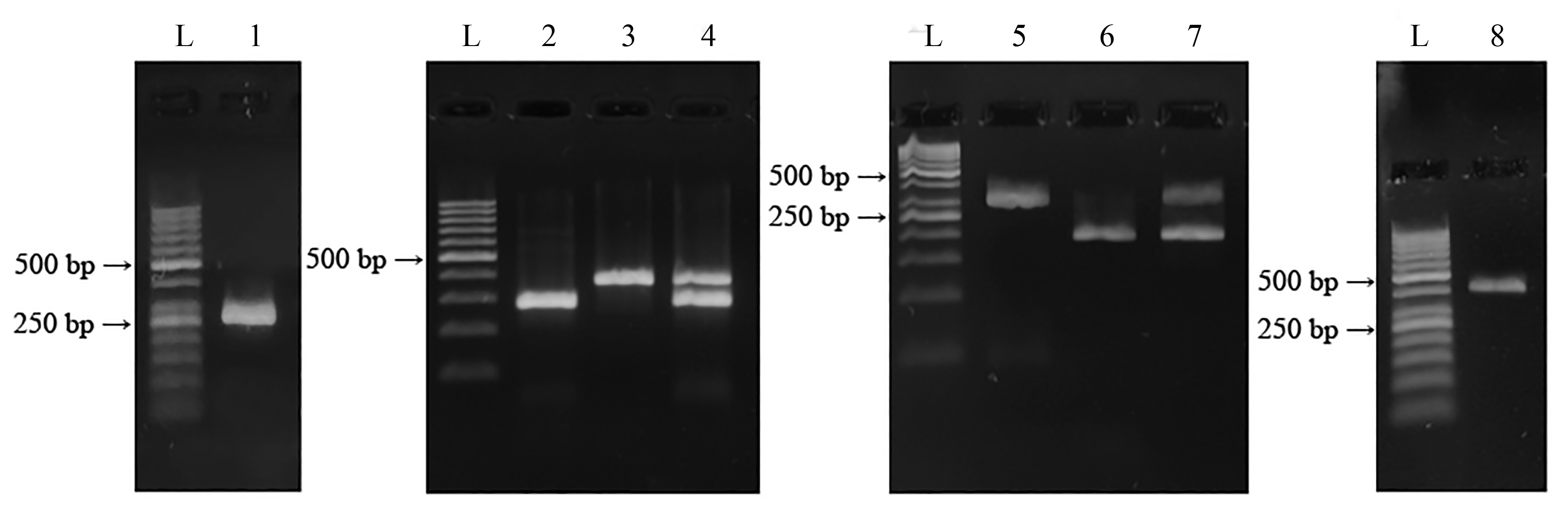 1. Determination of the pathogen DNA by electrophoretic separation of PCR products. L – GeneRuler 50bp length marker, (1) S. pneumoniae, (2) S. aureus, (3) L. pneumophila, (4) S. aureus + L. pneumophila, (5) H. influenzae, (6) P. aeruginosa, (7) H. influenzae + P. aeruginosa, (8) K. pneumoniae. | |