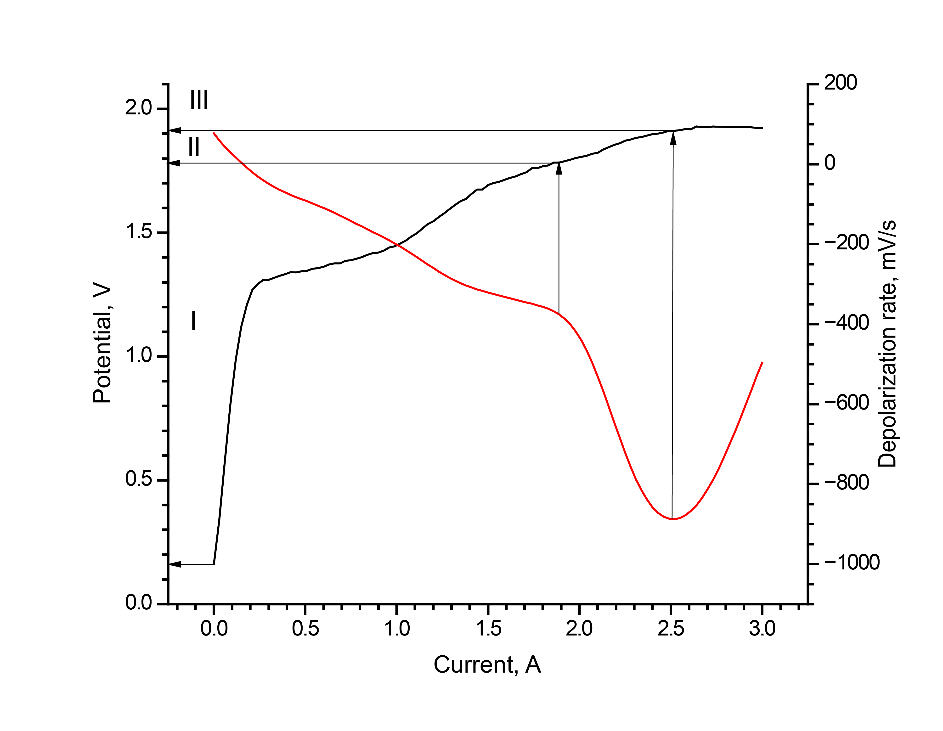 Methods. Using the electrochemical technological complex EHK-1012 (developed by IP Tetran) and a non-compensatory method of measuring potential, polarization and depolarization curves with a change in pulse duration and a pause between them were recorded. The current pulses had an amplitude ranging from 0 to 3.5 A (when recording the polarization and depolarization curves), pulse durations ranging from 200 to 1200 ms, and a pause (delay) between pulses ranging from 50 to 500 ms. There were no reverse current pulses.