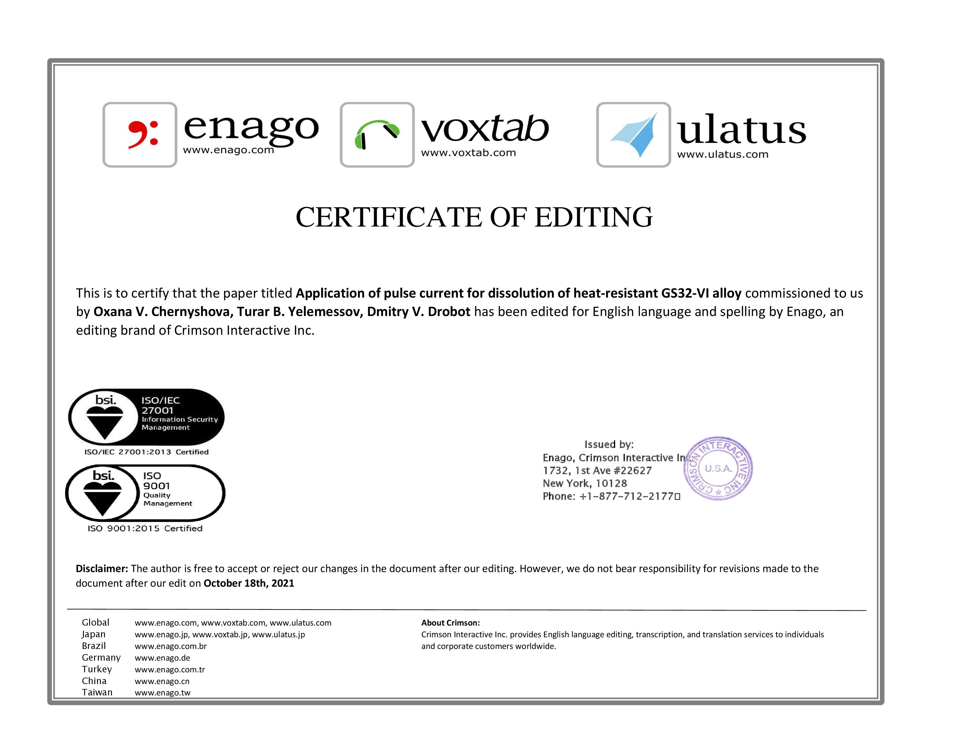 2. This is to certify that the paper titled Application of pulse current for dissolution of heat-resistant GS32-VI alloy commissioned to us by Оxana V. Chernyshova, Тurar B. Yelemessov, Dmitry V. Drobot has been edited for English language and spelling by Enago, an editing brand of Crimson Interactive Inc. | |