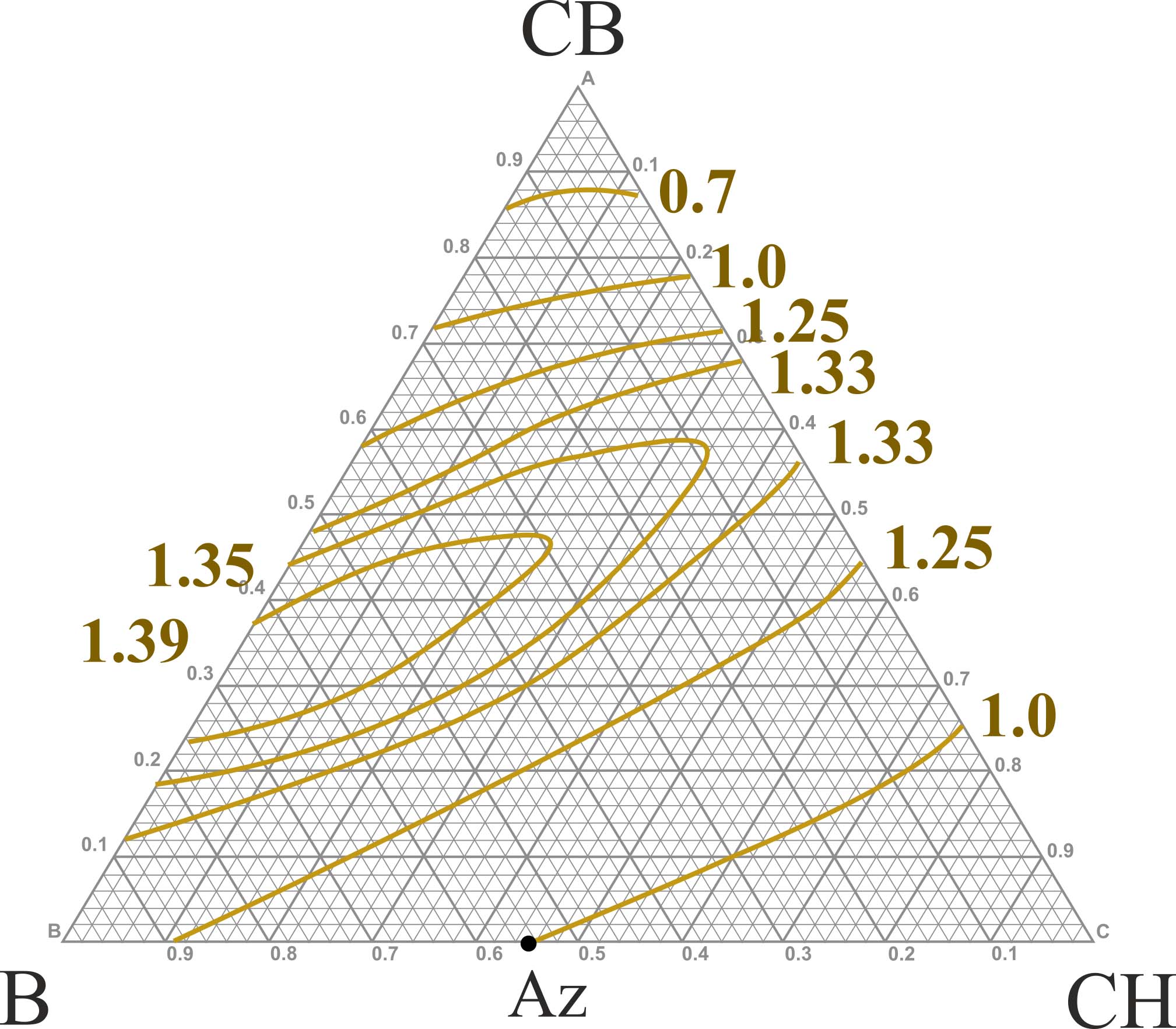 1. Diagram of the relative volatility isolines of a cyclohexane (CH)–benzene (B) pair | |