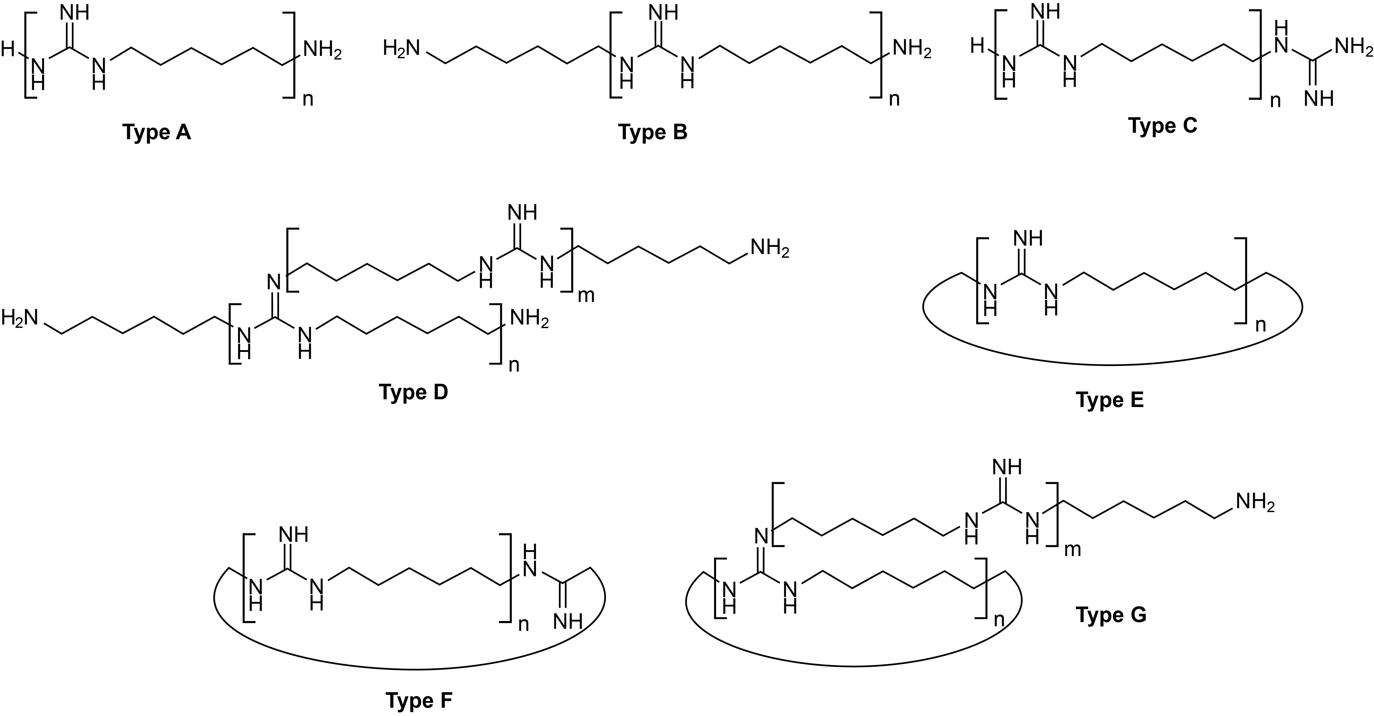1. Polyguanidine derivatives formed during synthesis: A, B, C (linear), D (branching), E, F (cyclic), and G (cyclic branching). | |