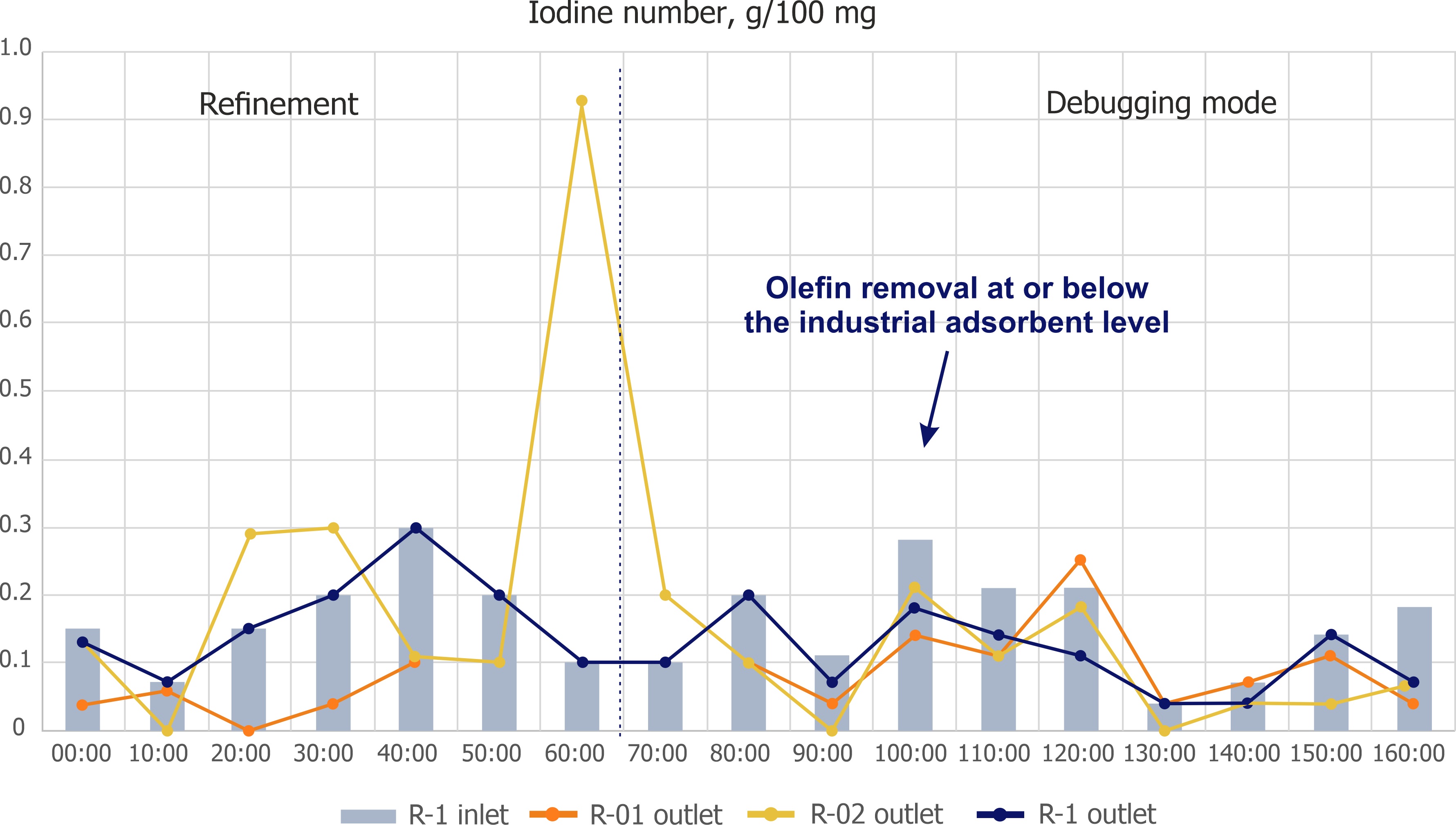 1. Iodine number in the flow at the inlet and outlet of the adsorbers. | |