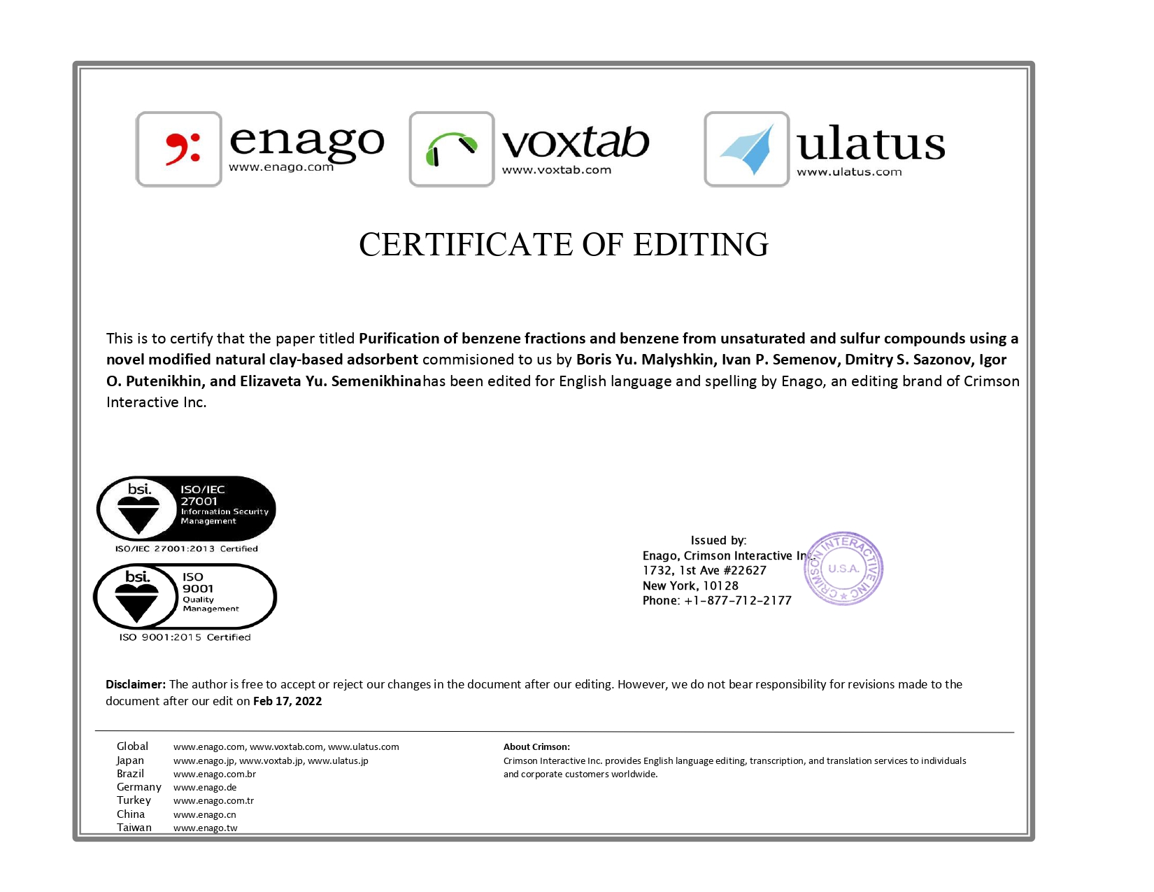2. This is to certify that the paper titled Purification of benzene fractions and benzene from unsaturated and sulfur compounds using a novel modified natural clay-based adsorbent commisioned to us by Boris Yu. Malyshkin, Ivan P. Semenov, Dmitry S. Sazonov, Igor O. Putenikhin, and Elizaveta Yu. Semenikhinahas been edited for English language and spelling by Enago, an editing brand of Crimson Interactive Inc. | |