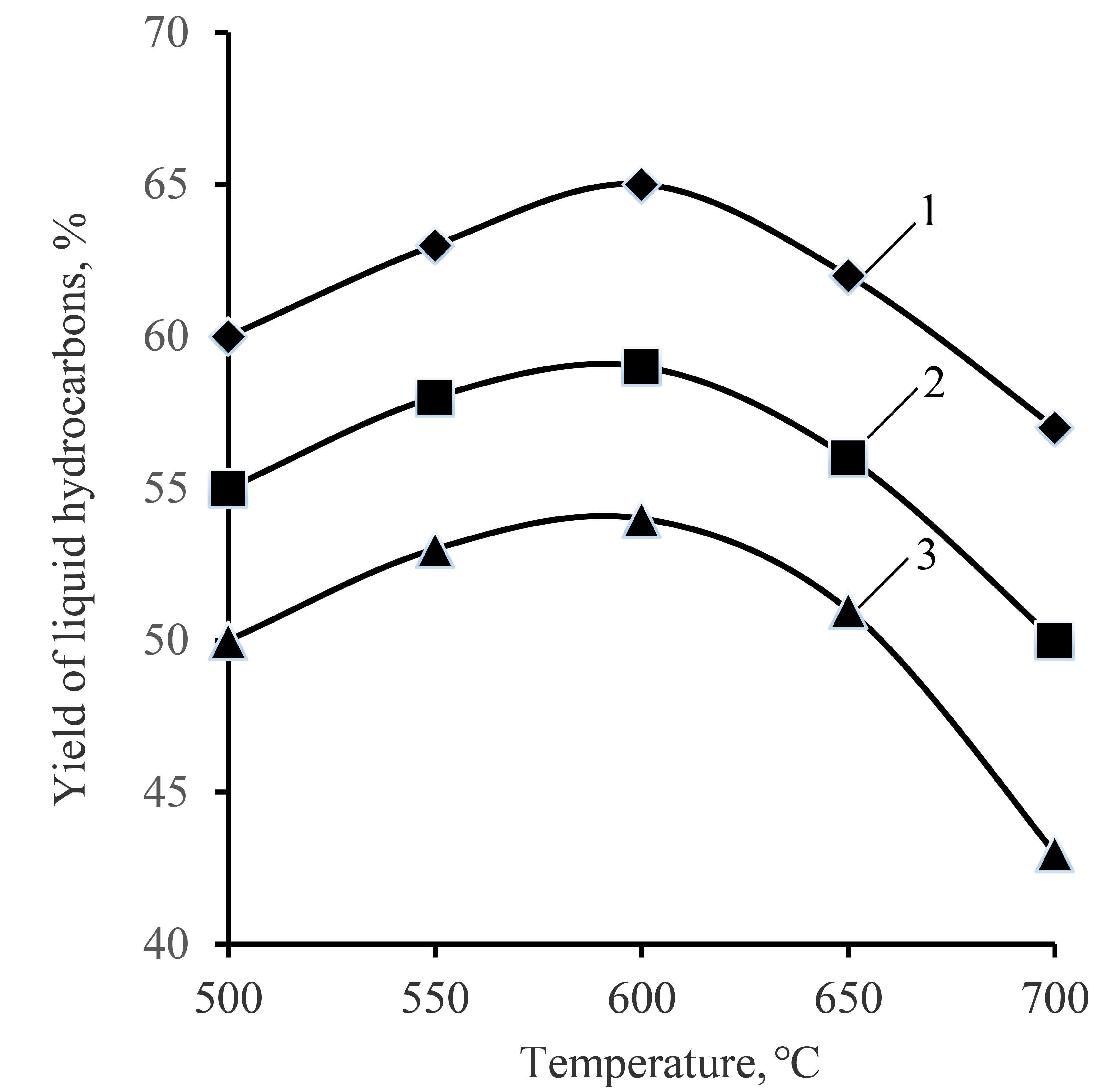 1. Effect of the coking process conditions on the yield of liquid products. Coking pressure is at (1) 0.10 MPa, (2) 0.20 MPa, and (3) 0.35 MPa.