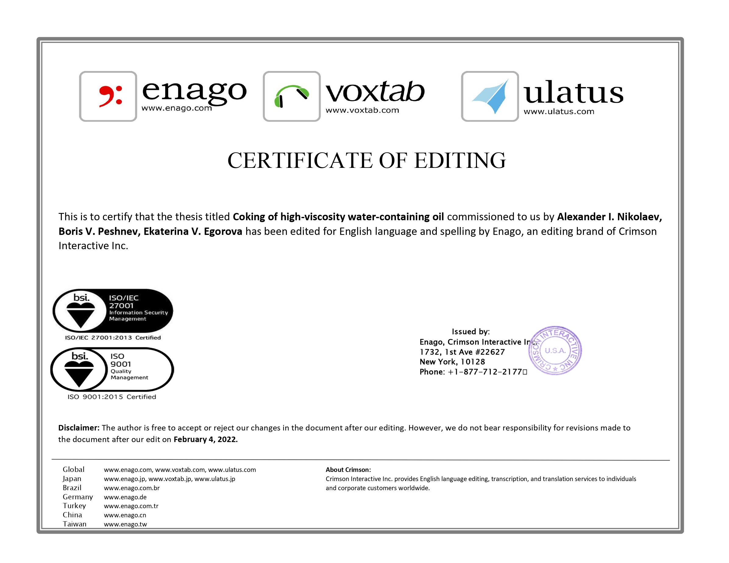 2. This is to certify that the thesis titled Coking of high-viscosity water-containing oil commissioned to us by Alexander I. Nikolaev, Boris V. Peshnev, Ekaterina V. Egorova has been edited for English language and spelling by Enago, an editing brand of Crimson Interactive Inc.