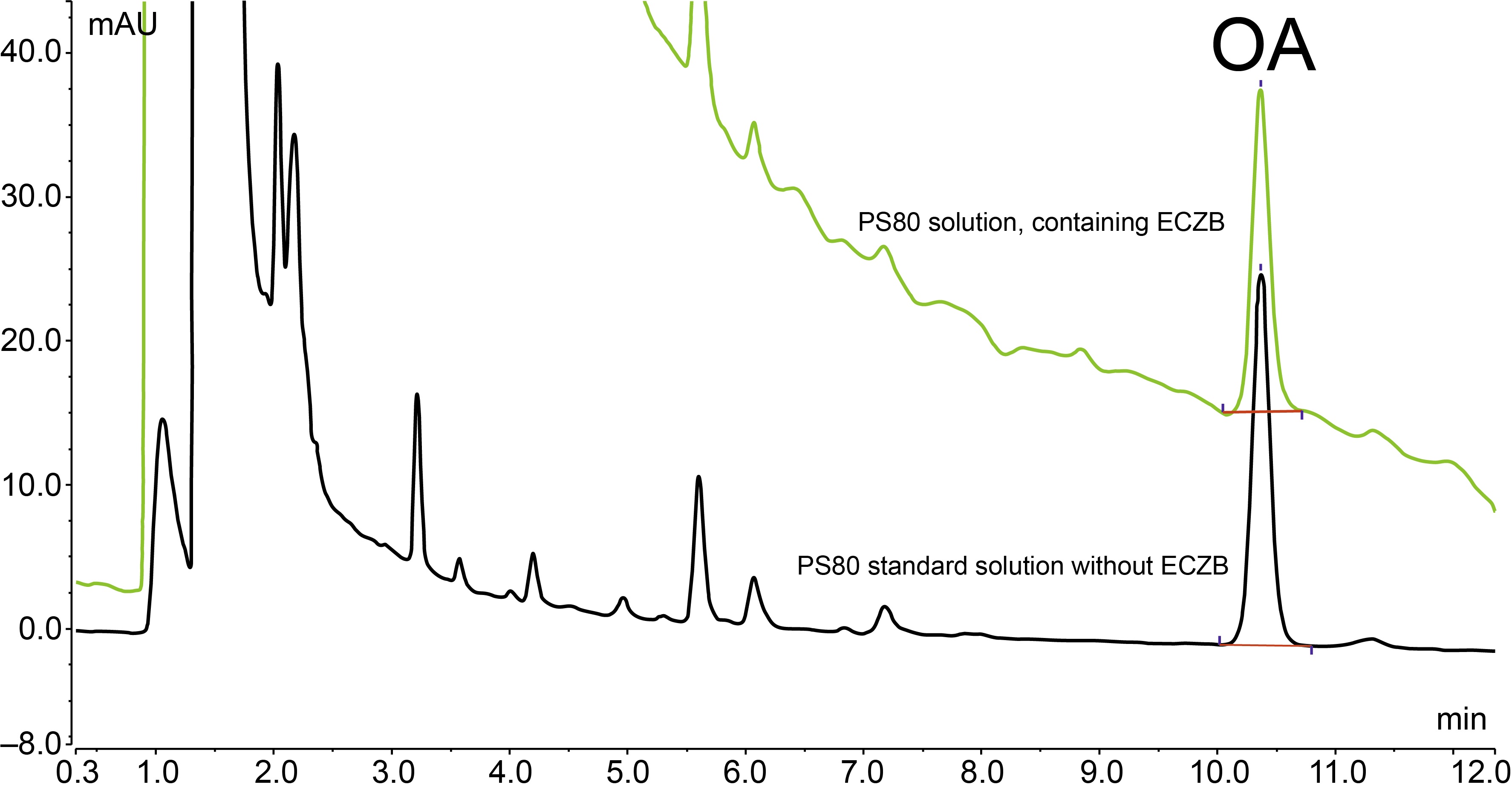 1. Representative chromatogram of a 0.22 mg/mL PS80 solution. The OA retention time is 10.3 min. | |