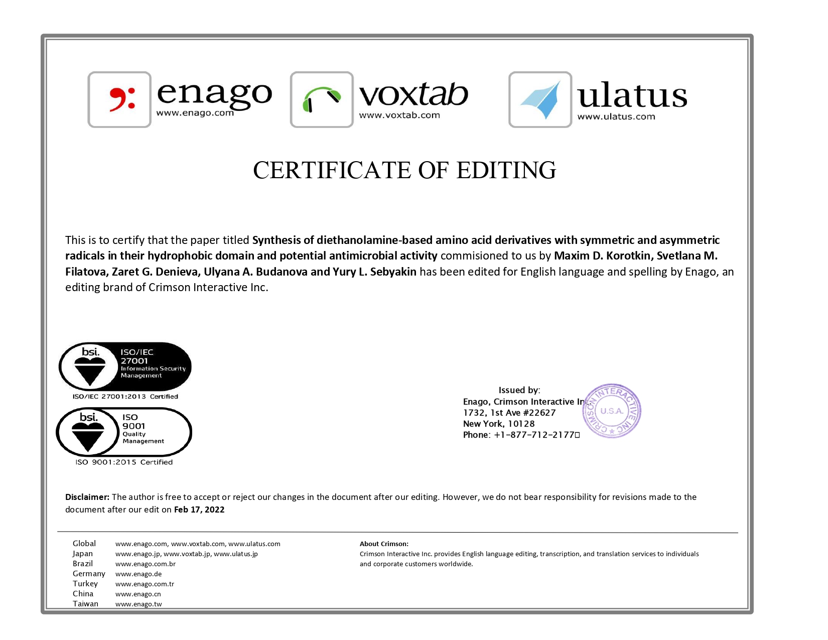 2. This is to certify that the paper titled Synthesis of diethanolamine-based amino acid derivatives with symmetric and asymmetric radicals in their hydrophobic domain and potential antimicrobial activity commisioned to us by Maxim D. Korotkin, Svetlana M. Filatova, Zaret G. Denieva, Ulyana A. Budanova and Yury L. Sebyakin has been edited for English language and spelling by Enago, an editing brand of Crimson Interactive Inc. | |