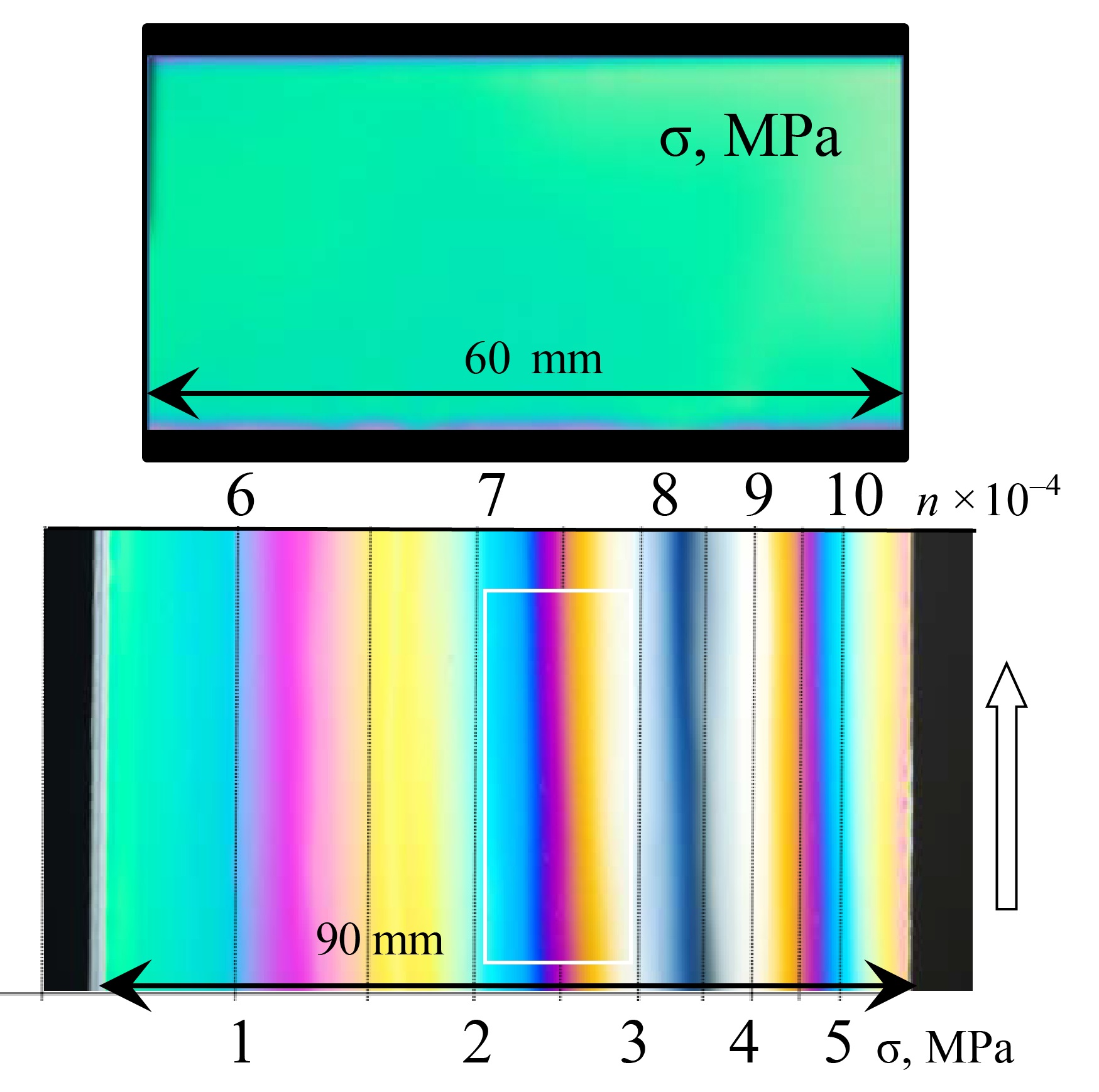 • A quantitative relationship was established between the stresses affecting monolithic polycarbonate sheets, their birefringence, and the characteristics of the combined spectrum of interference images of loaded samples obtained in polarized light in crossed polaroids.