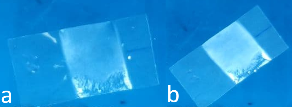 1. Dichroism effect in a sample interval polypropylene film in transmitted polarized light when film sample is located relative to polarizers at angles 15° (a) and 45° (b).