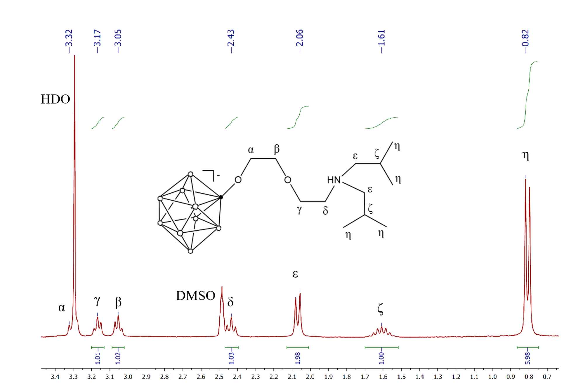 1. 1H ЯМР-спектр Cs[B10H9O(CH2)2O(CH2)2NH(CH2CH(CH3)2)2] в ДМСО-d6.