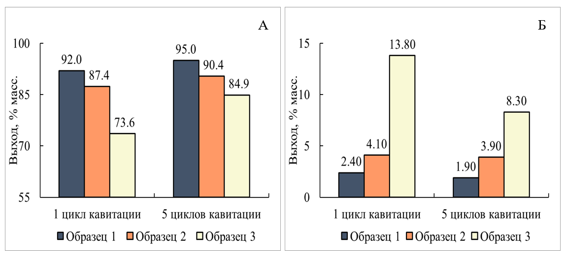 1. Influence of the number of processing cycles of raw materials on the yield of liquid (A) and solid (B) coking products. | |