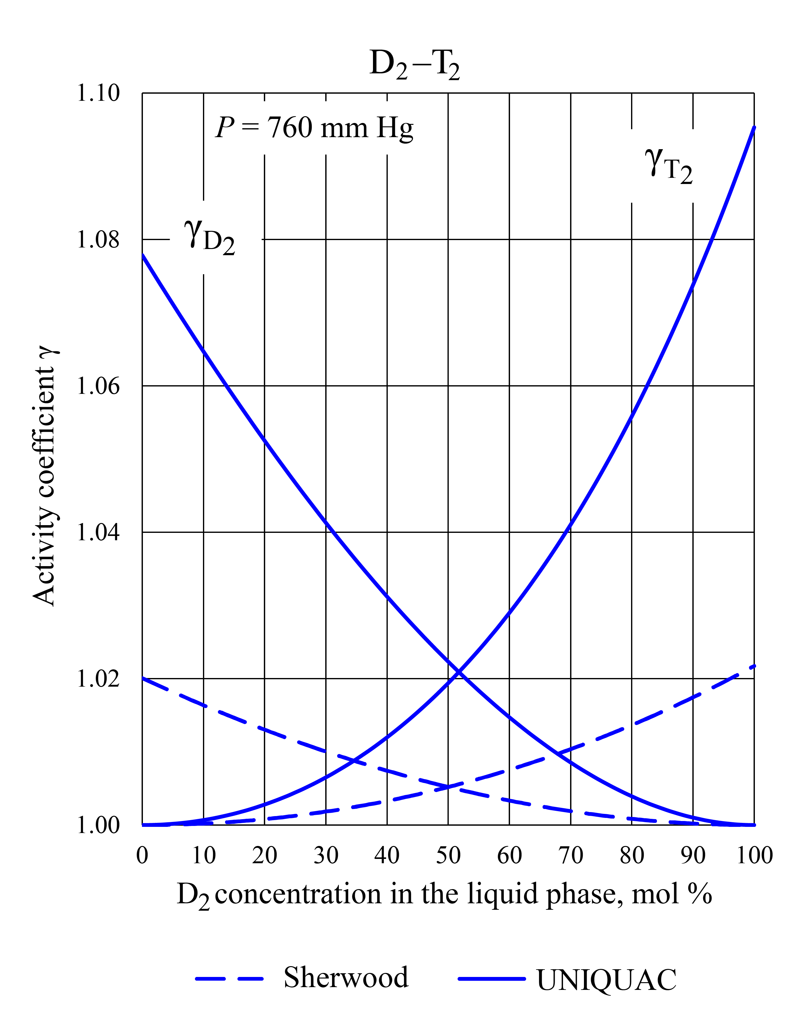 1. Calculated dependencies of activity coefficients of D2–T2 mixture components on D2 concentration in the liquid phase at atmospheric pressure.
