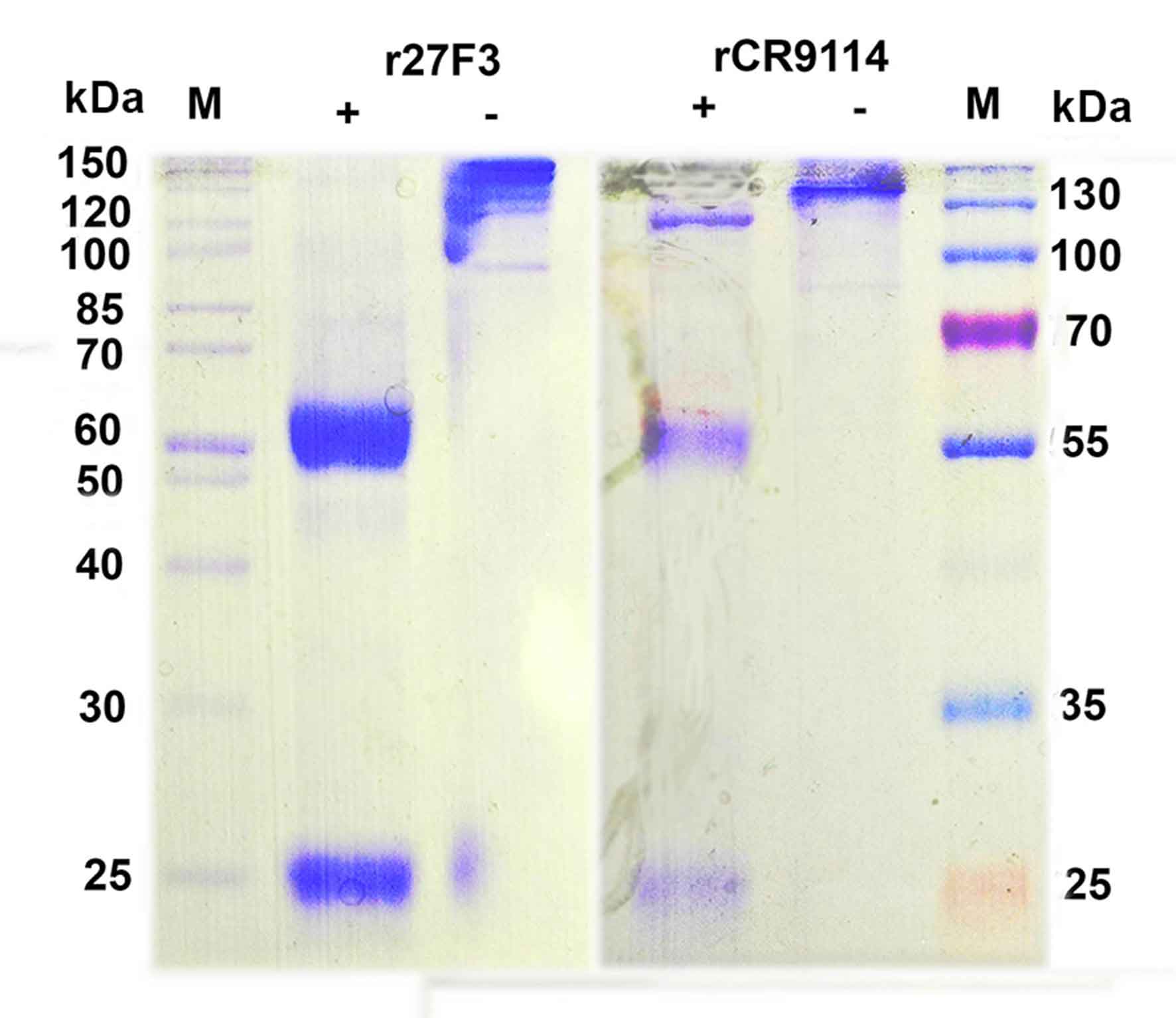 1. Electropherogram of purified r27F3 and rCR9114 antibodies | |