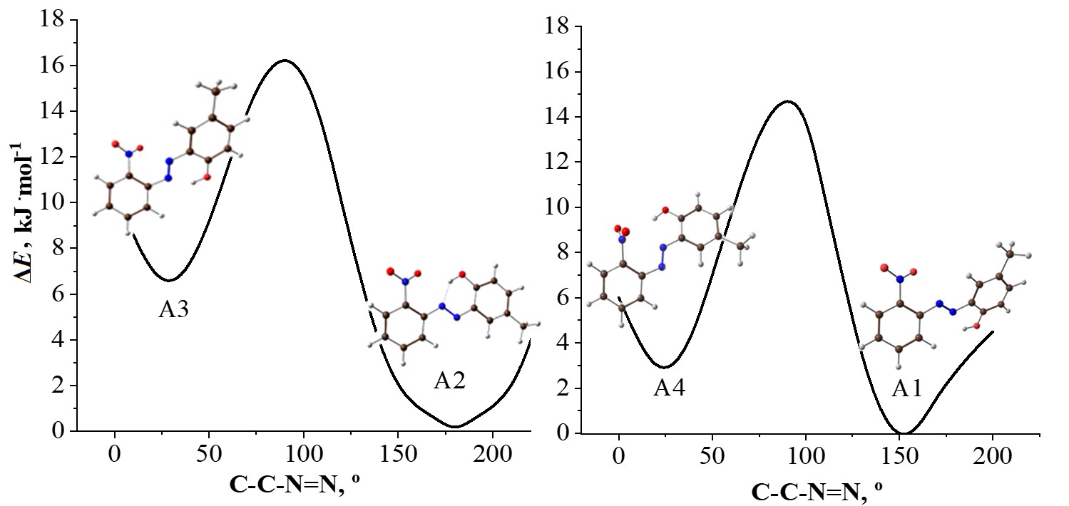 Conclusions. A comparison of the experimental and calculated results supports the conclusion that the cis-isomer should be considered most probable for the gas phase. For the studied solutions, a trans-isomer of 2NAB with hydrogen bonds formed between the hydroxyl group hydrogen and the β-nitrogen atom of the azo group of dye molecule should be considered as the most likely structure. In the studied individual and binary solvents, prototropic equilibrium is shifted towards the azo form of the dye, while intramolecular proton transfer is possible only in aqueous diethylamine and dimethylformamide solutions with additions of NaOH.