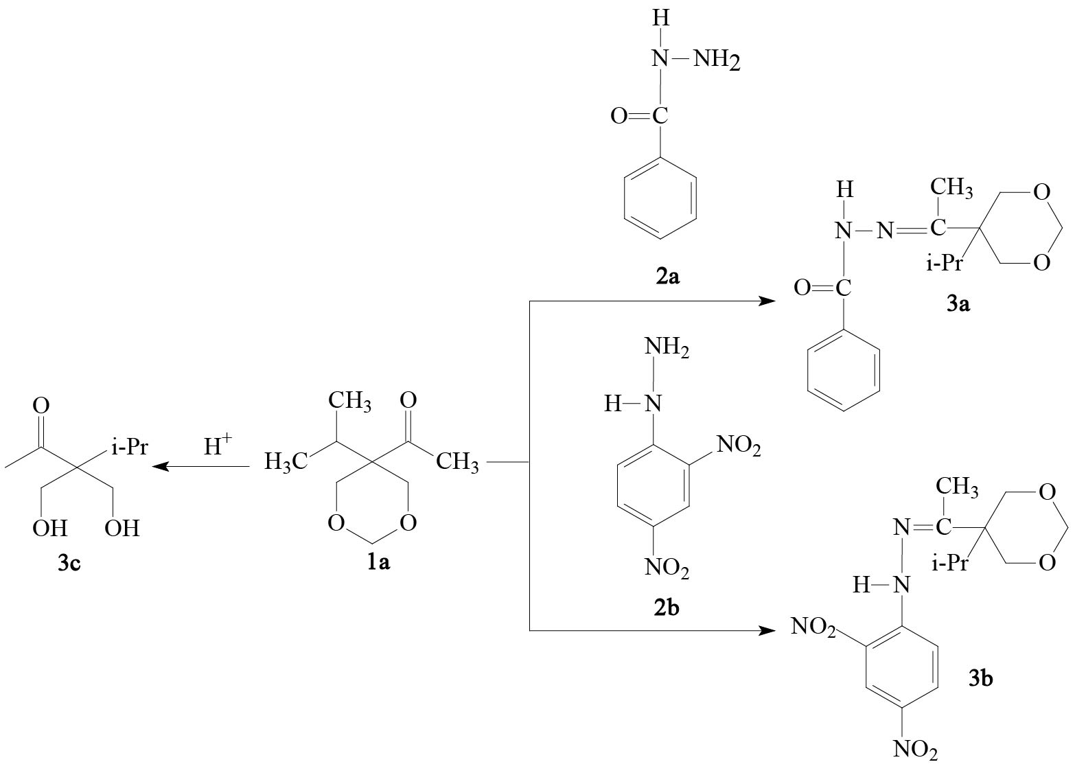1. Scheme of reactions of 1-(5-isopropyl-1,3-dioxan-5-yl)ethanone 1a. | |