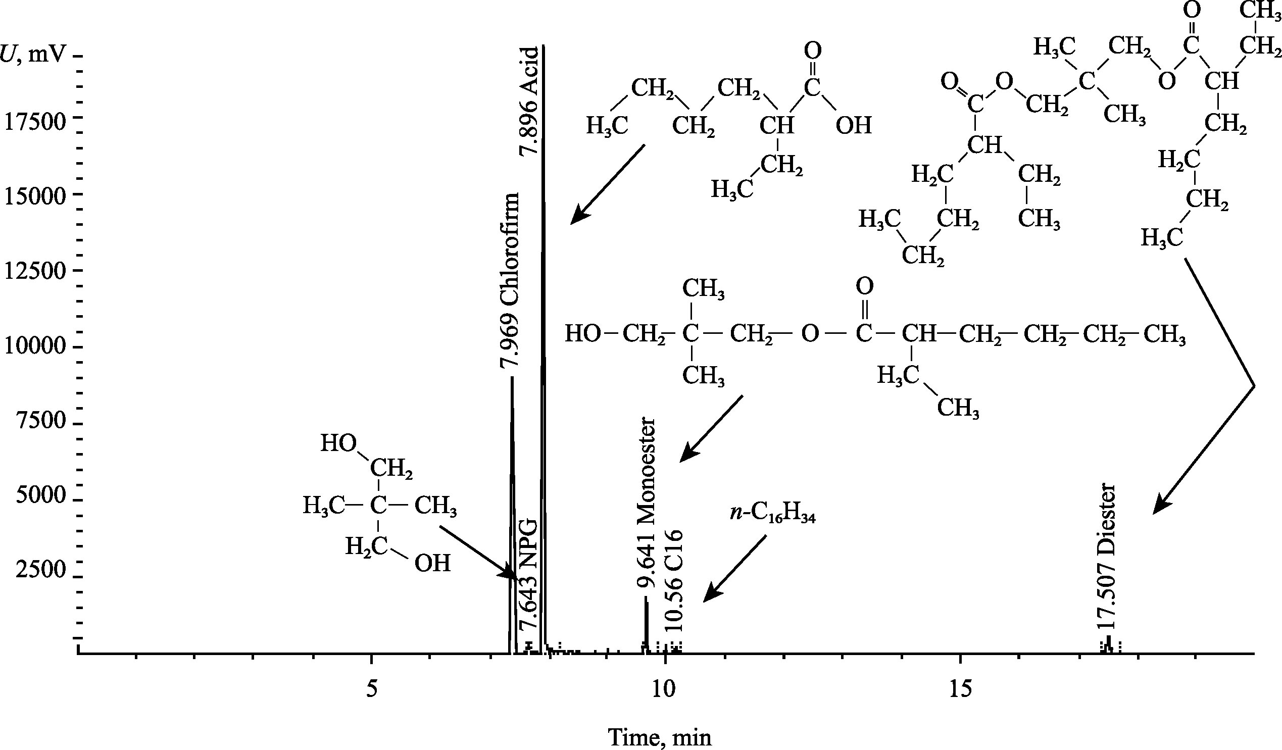 1. Chromatogram of the reaction mass of neopentyl glycol di(2-ethylhexanoate) synthesis | |