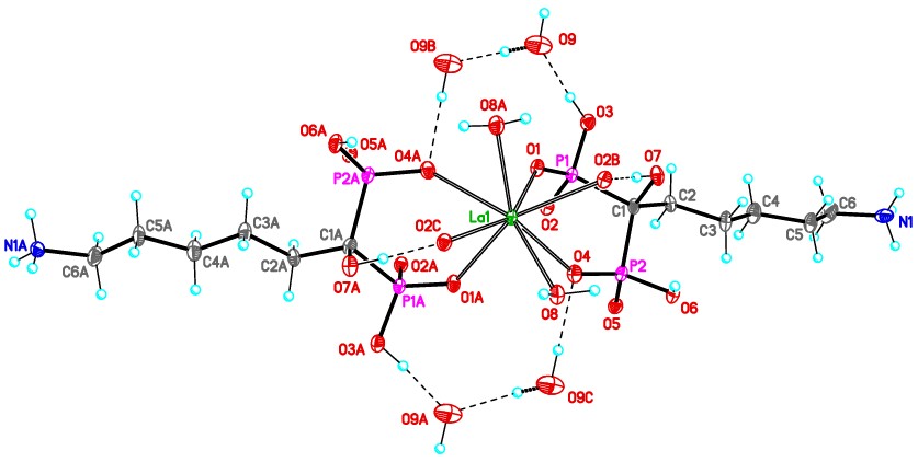 Currently, various amino bisphosphonates are widely used in the treatment of many bone diseases. One of the most well-known complex compounds of neridronic acid (6-amino-1-hydroxyhexylidene-1,1- bisphosphonic acid) is sodium neridronate – a bisphosphonate, which is used to treat osteogenesis and Paget's disease. However, there is no data on compounds of neridronic acid with rare earth elements. A new complex of lanthanum with 6-amino-1-hydroxyhexylidene-1,1-bisphosphonic acid (I) was obtained and characterized by various physicochemical methods (chemical analysis, IR spectroscopy, solid-phase 31P NMR spectroscopy, optical microscopy, PCA, DTA). According to the research data the complex I has the composition {La[(H3N-(CH2)5-C(OH)(PO2(OH))2]2(H2O)2}[OH]·H2O and represents the coordination 1D-polymer due to two bridged phosphonic groups with lanthanum atoms in a tetragonal-antiprismatic environment. In a crystal, polymer chains form a 3D-frame porous structure by means of strong hydrogen bonds O─H ··· O and N─H ··· O with endless channels, available to include a variety of inorganic anions or small organic molecules. A study under the microscope showed that the sample is needle crystals (thin rods) of different lengths. The particle size distribution was obtained by laser diffraction, and the average particle size was determined: 50 µm in length and 2.5 µm in thickness.