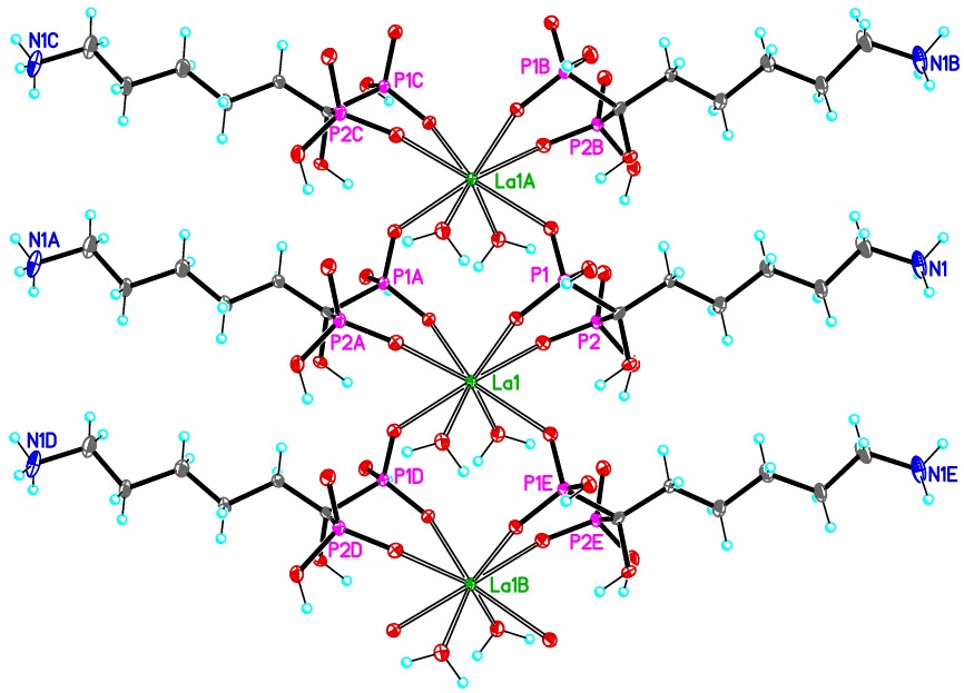 1. Fig. 3. Elementary link of the polymer complex I. Bond lengths and valence angles: La1─O1 2.466(3) Å, La1─O4 2.485(3) Å, La1─O2 2.510(3) Å, P1─O1 1.528(3) Å, P1─O2 1.529(3) Å, P2─O4 1.518(3) Å, O1─La1─O4 73.01(9)°, O1─La1─O2 152.85(9)°, O4─La1─O2 76.57(9) | |