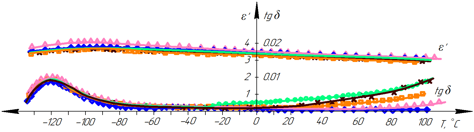 1. Temperature dependence of tgδ and ɛ' on the type of hardener at a frequency of 1000 Hz