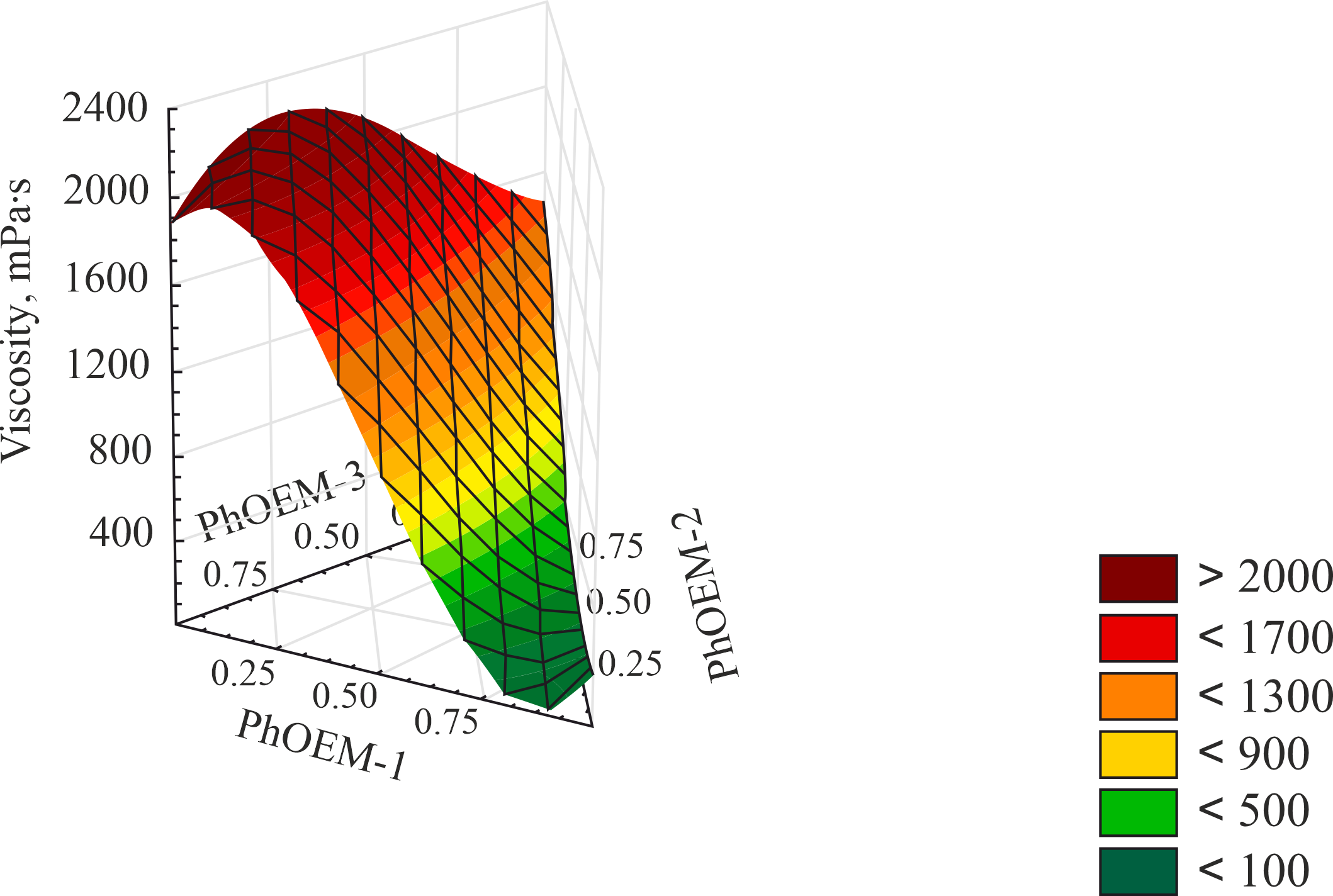 Objectives. To obtain polymer composite materials (PCM) with enhanced physicomechanical properties using the vacuum assisted resin transfer molding (VaRTM) method, binders must have a viscosity of up to 500 mPa∙s. In some cases, this leads to restrictions on the use of certain materials or requires the use of temporary diluents. This is closely related to the deterioration of other required composite characteristics, such as increased flammability. Three phosphorus-containing oligoester(meth)acrylates PhOEM-1, PhOEM-2, and PhOEM-3 were synthesized with significant differences in viscosity characteristics in the series PhOEM-1 << PhOEM-2 << PhOEM-3. The polymer based on PhOEM-1 exhibits inferior physicomechanical properties despite having lower viscosity. Hence, the aim of the study was to investigate the viscosity characteristics of mixtures of methacrylate binders of the same nature but different structures and functionalities. This was done by studying the rheological properties of the original oligoester(meth)acrylates and their mixtures taken in various ratios. The method used was to optimize compositions via a simplex lattice (Scheffe’s plan), in order to obtain PCM using the VaRTM technology.