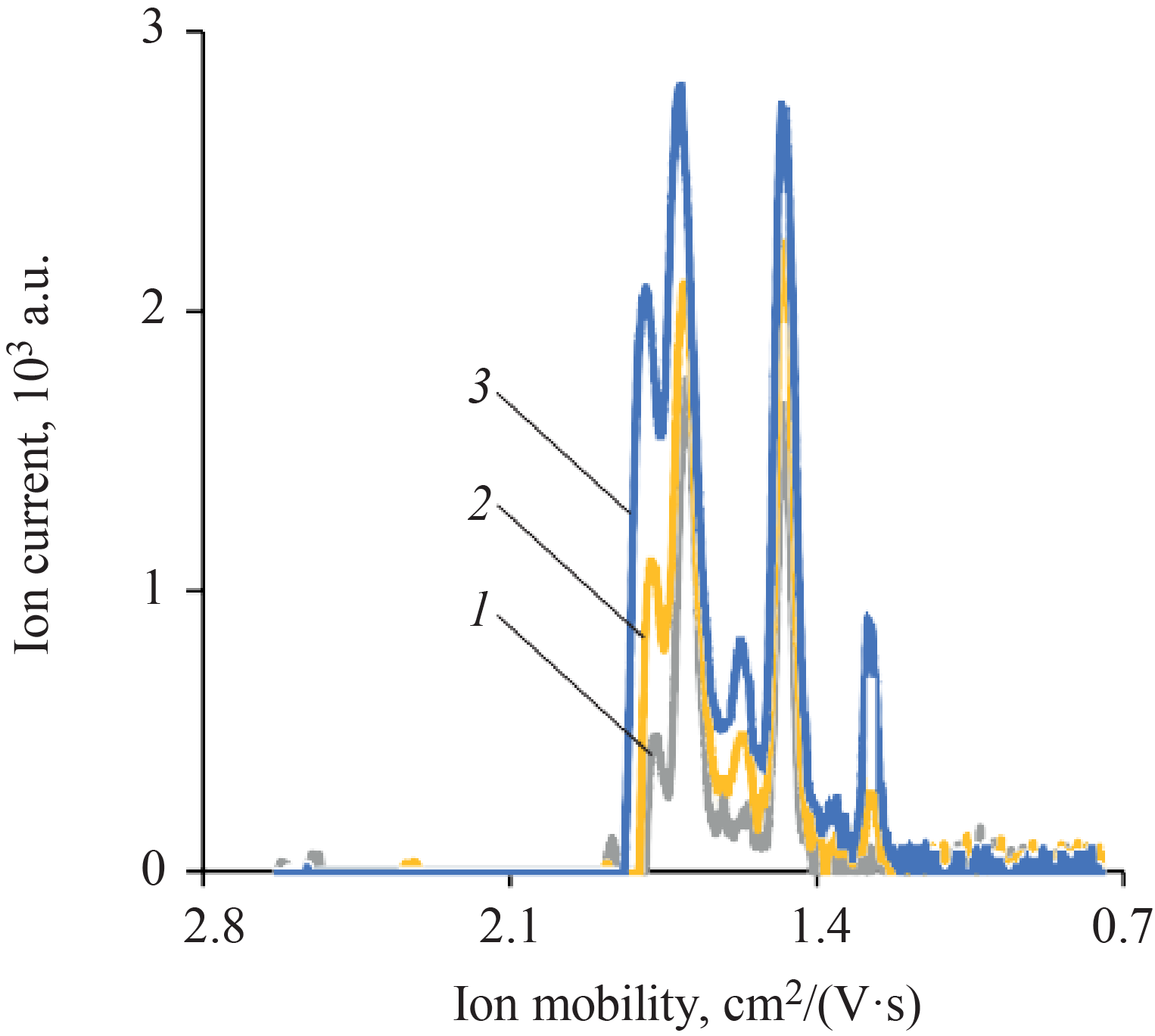 Results. The ion mobilities of chloroacetophenone, tris(2-chloroethyl)amine, and methanethiol were determined. A method for recording ion mobility spectra and their mathematical processing was developed. The dependencies of the change in ion mobility spectra on the analyte concentration were also studied. Possible mechanisms were proposed for the formation of the ion mobility spectra observed, in accordance with the ionization features of chloroacetophenone, tris(2-chloroethyl)amine, and methanethiol. The enthalpies of ion formation were calculated. The ionization schemes of the compounds were shown. The generalized results of experimental studies were presented, as were the features of compound identification taking into account the structure of the spectra, the concentrations of substances, and the detection conditions.