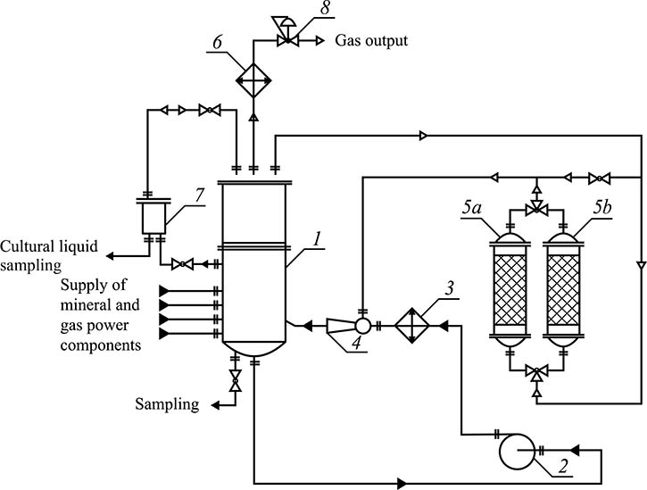 Objectives. The work set out to develop a bioreactor that incorporates a carbon dioxide removal unit within the apparatus gas phase, which is capable of operating without the need for supplementary compression apparatus. As part of testing the developed equipment in order to ascertain its capacity for enhanced biomass production, the principal fermentation system parameters that facilitate the optimal bioreactor productivity in conditions of carbon dioxide removal from the apparatus gas phase were identified.