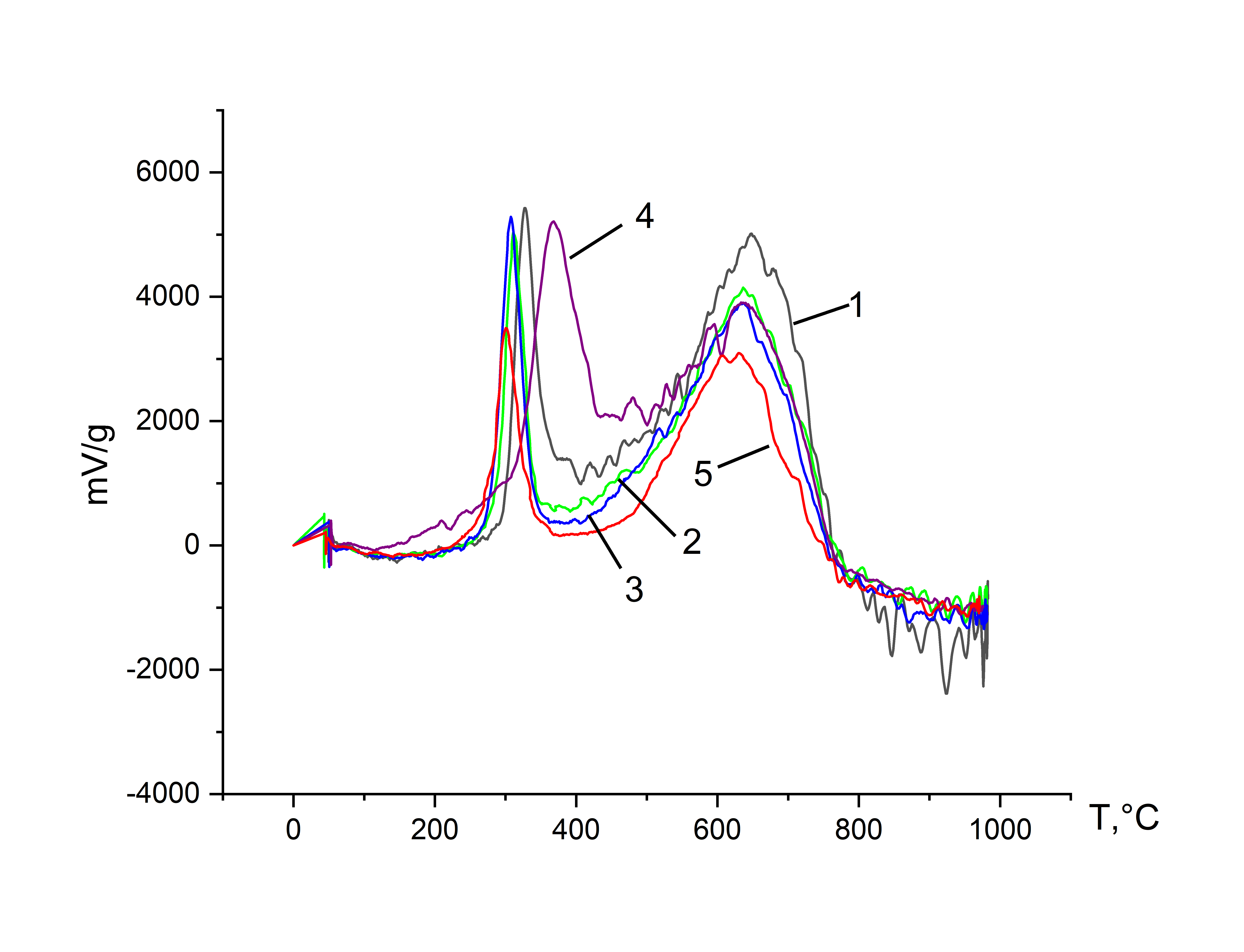 1. Curves of thermoprogrammed reduction (TPR) after reduction of S2 catalyst for 1 h at different temperatures