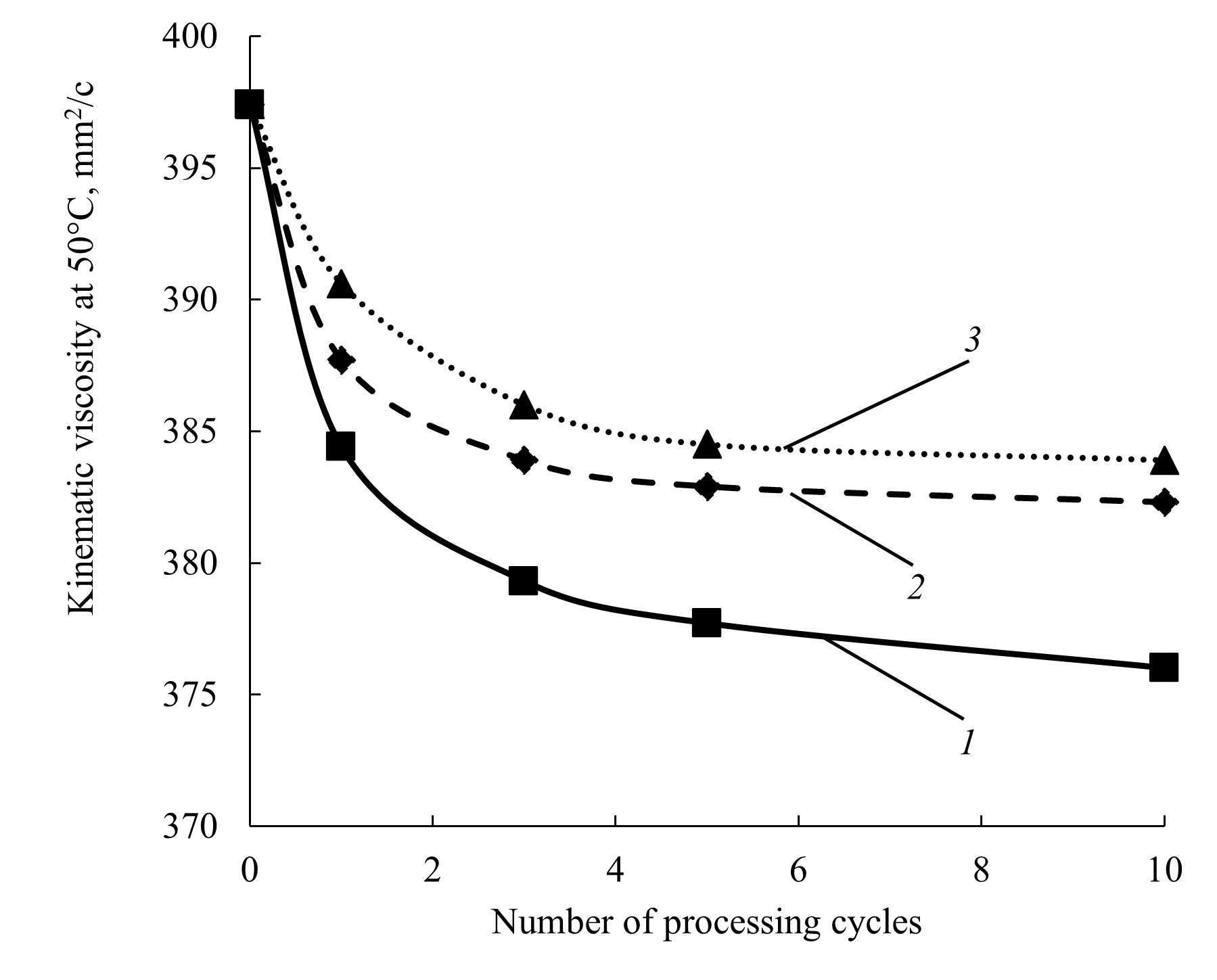 1. Effect of hydrodynamic treatment conditions on the viscosity of straight–run fuel oil: (1) immediately after treatment; (2) after 5 days; (3) after 20 days | |